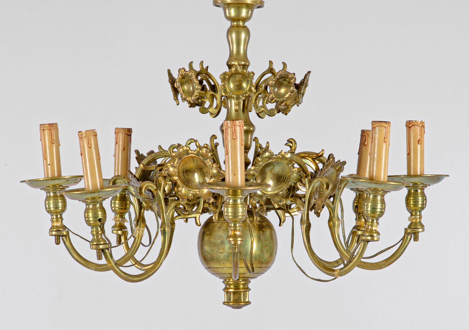 8-flg.; Bronze. Balusterförmiger Schaft, davon ausgehend stark geschwungene Leuchterarme mit großen Traufschalen über vasenförmigen Tüllen. Gestuft angeordnete, sonnenförmige Blaker. Elektrifiziert. H. 40 cm. D. 66 cm.