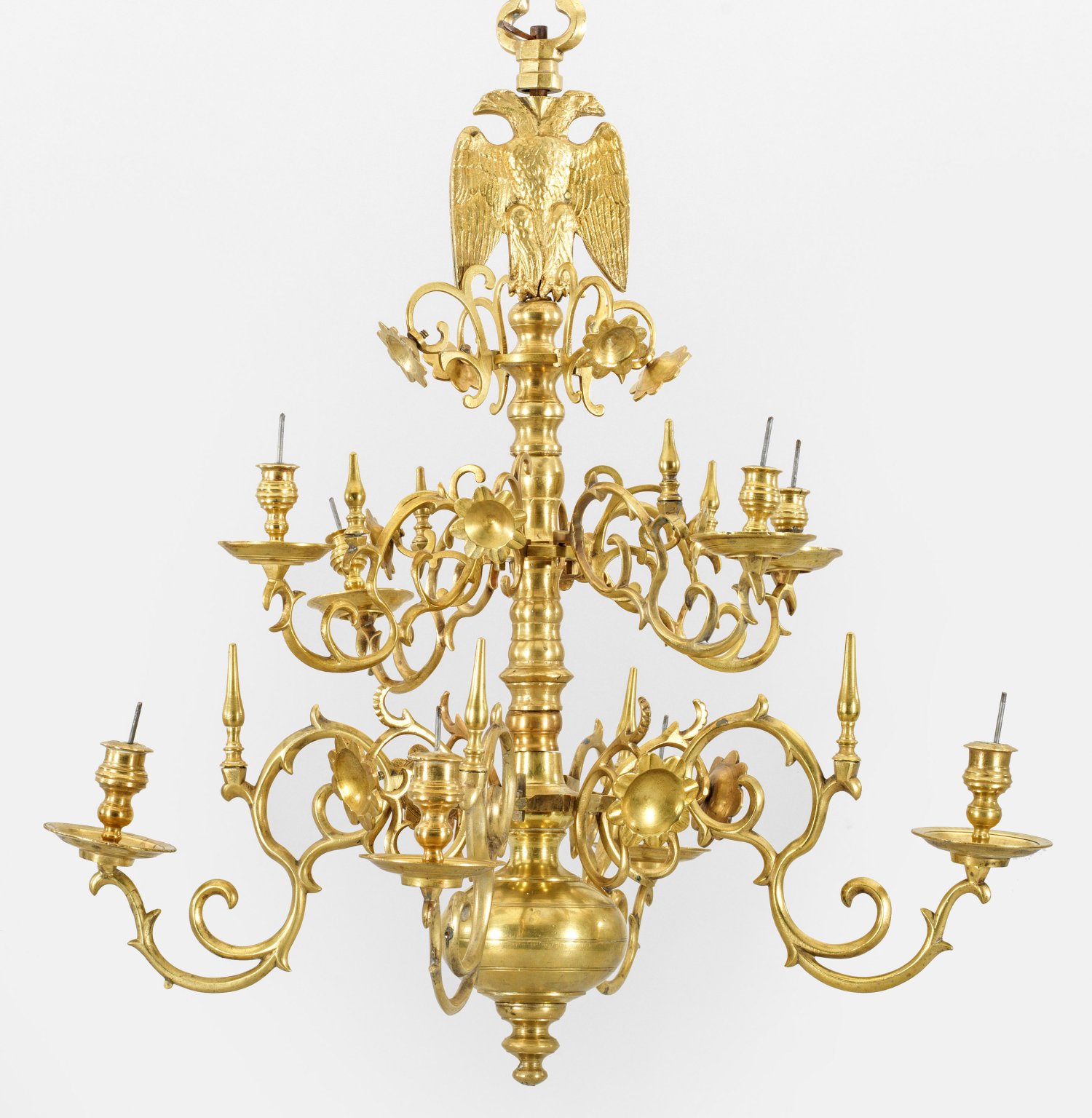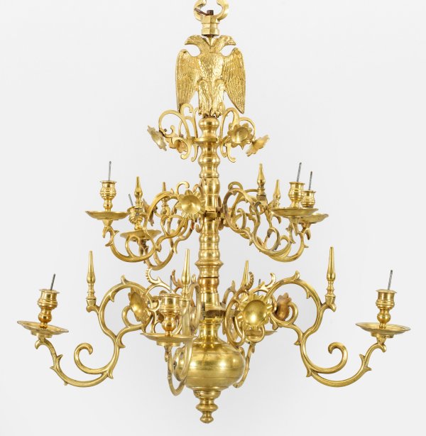 8-flg.; Bronze. Mehrfach gegliederter Balusterschaft mit großem, kugelförmigem Abschluss sowie reliefiertem oberen Abschluss in Form eines Doppeladlers. Davon ausgehend gestuft angeordnete, stark geschwungene Leuchterarme aus Voluten mit Balusterbekrönungen sowie vasenförmigen Tüllen über Traufschalen. Dazwischen korrespondierende Streben für blütenförmige Blaker. H. 68,5 cm. D. 62 cm.