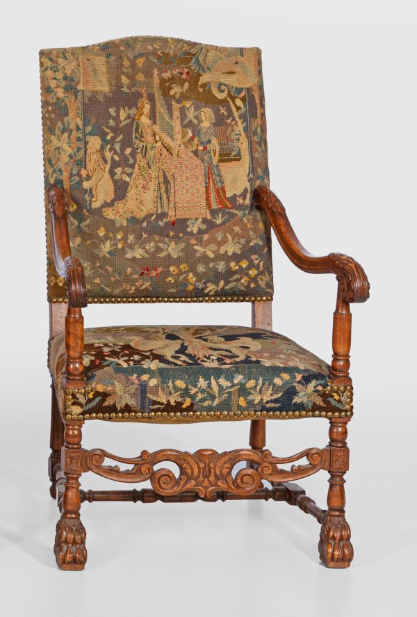 Nussbaum, reliefplastisch geschnitzt. Trapezförmige Zarge auf gegliederten Balusterbeinen mit stilisierten Tatzen, durch breiten Steg aus gegeneinander gestellten Voluten verbunden. Entsprechende Stütze für geschweift ansteigende Armlehne sowie hohe Rückenlehne. Gepolstert und mit szenisch gestalteter Petit Point-Stickerei bezogen. H. 117 cm. 67 cm x 67 cm. Sitz-H. 46 cm.
