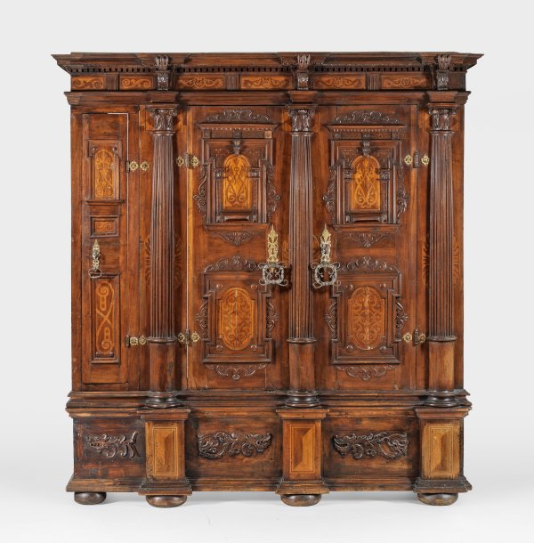 Nussbaum, furniert sowie reliefplastisch geschnitzt. Gerader, hochrechteckiger Korpus auf hohem Profilsockel. Architektonisch gegliederte, asymmetrisch angelegte Fassade aus drei Türen unterschiedlicher Größe, flankiert von eingestellten, kannelierten Säulen mit ionischen Kapitellen. Profilierte Füllungen mit Segmentbögen, umgeben von erhaben reliefierten Grotesken und Volutenmotiven. Korrespondierender Einlagendekor. Vorkragendes, teilw. verkröpftes Gesims mit Hauszeichen sowie 1617. Spätere Ergänzungen. H. 219 cm. 208 cm x 64 cm.