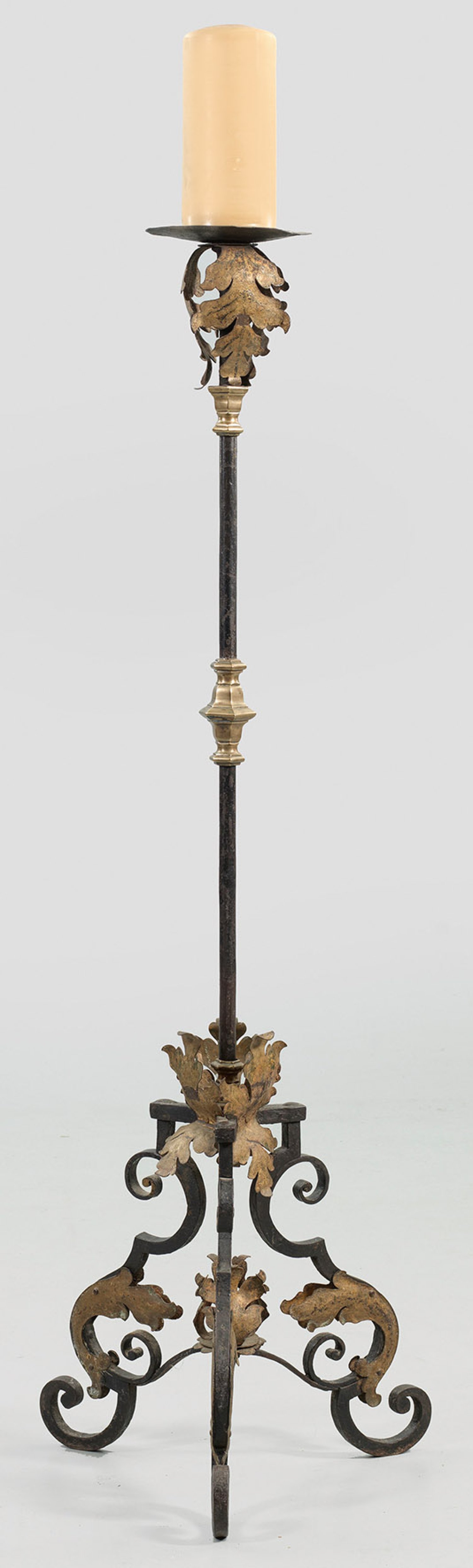 1-flg.; Schmiedeeisen und Bronze. Über stark geschwungenen, gegeneinander gestellten und eingerollten Voluten schlanker Schaft mit Balusterelementen als Träger für Leuchtmittel mit kräftigem Dorn über runder Traufschale. Dekorationen aus vergoldetem Blattwerk. H. 190 cm.