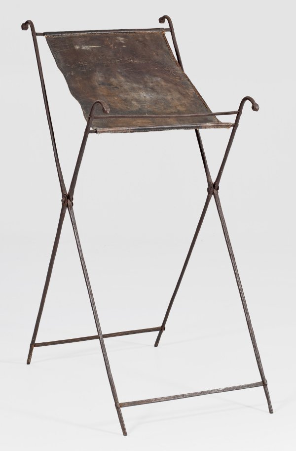 Schmiedeeisen, geschwärzt. Zusammenklappbares, filigranes Scherengestell in gebogten, kugelförmig gekanteten Abschlüssen endend. Die Scharniere mit Blüten verziert. Dunkelbraune Lederbespannung als Auflage für Schriftrollen oder Bücher. H. 142 cm. 60 cm x 88 cm.