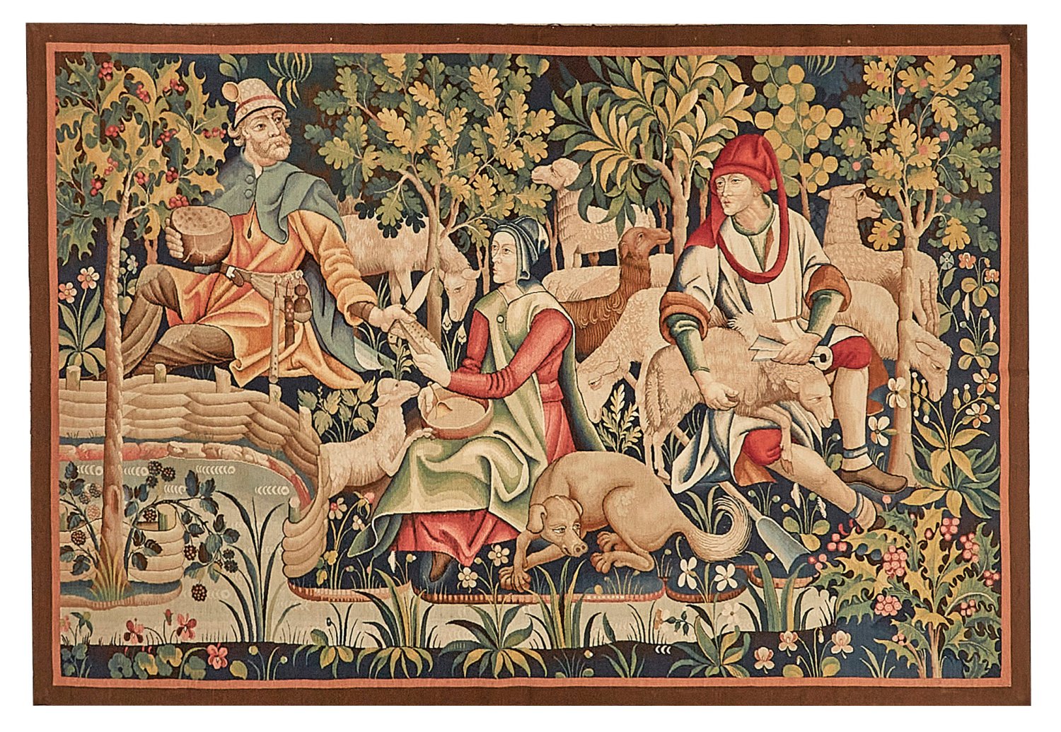 Wolle in unterschiedlichen Beige- und Grüntönen, flach gewebt. Im Bildfeld flächendeckende historisierende Darstellung einer rastenden Schäferfamilie mit Hund und Herde beim Schneiden eines Brotlaibs bzw. beim Scheren der Schafe, in stark stilisierter Landschaft mit Flusslauf mit unterschiedlichen Bäumen wie Eiche und Ilex nach dem Vorbild des 1470 in Tornai entstandenen Originals im Brüsseler Kunst- und Geschichtsmuseums. Umlaufend schmale Rahmung aus unterschiedlichen Brauntönen. 164 cm x 245 cm.