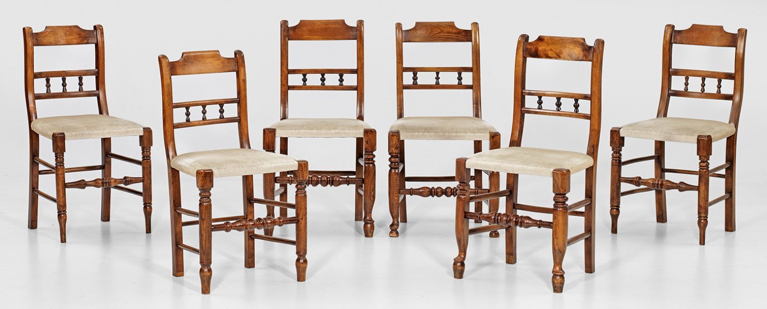 Kirschbaum und Rüster, mahagonifarben gebeizt. Trapezförmige Sitzfläche auf Rundbeinen, durch Balusterstäbe verbunden. Leicht geschweifte Rückenlehnenrahmung mit breitem oberen Abschluss. Rest.; Sitz-H. 46 cm.