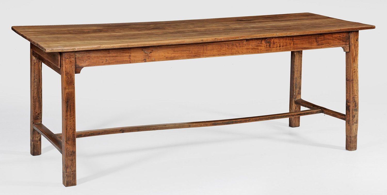 Kirschbaum. Gerade Zarge, an einer Kurzseite mit Schubfach, auf pfostenförmigen Beinen, unterhalb durch gekantete Stege verbunden. Rechteckige Deckplatte. H. 75 cm. 200 cm x 76,5 cm.