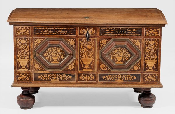 Eichenholz, schauseitig mit Einlagen aus Mahagoni und brandschattiertem Ahorn. Gerader, rechteckiger Korpus auf kräftigen Balusterfüßen mit flach gewölbtem Deckel. In der Front gerahmte Reserven mit blütengefüllten Vasenmotiven und Vögeln. Bez. "Alcke Meiner KRAM". H.85 cm. 133 cm x 68 cm.