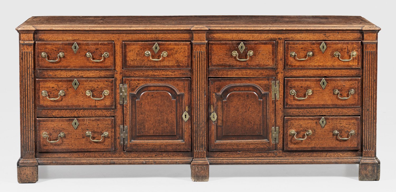 Eichenholz. Gerader, querrechteckig angelegter und seitlich kassettierter Korpus, flankiert von kannelierten Pilastern. In der gegliederten Front zwei Türen mit segmentförmigen Füllungen sowie acht Schubladen. Gering überstehende, profilierte Deckplatte. H. 85 cm. 198 cm x 50 cm.