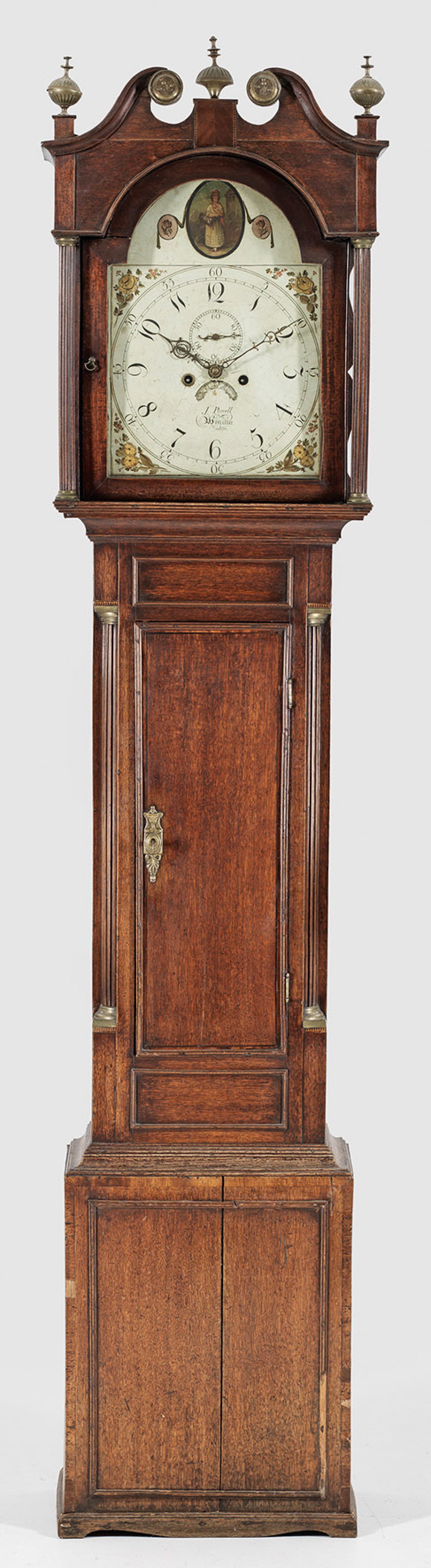 Sog. Grandfather's clock. Eichenholz, mahagonifarben gebeizt. Eintüriger Korpus, flankiert von Viertelsäulen auf gekantetem Sockel. Vorkragender Uhrenkopf mit gesprengtem Giebel. Polychrom gestaltetes Zifferblatt mit kleiner Sekunde, bez. "J. Powell Worchester". Werk mit Ankerhemmung und Schlagwerk auf Glocke. Überholungsbedürftig. H. 230 cm.