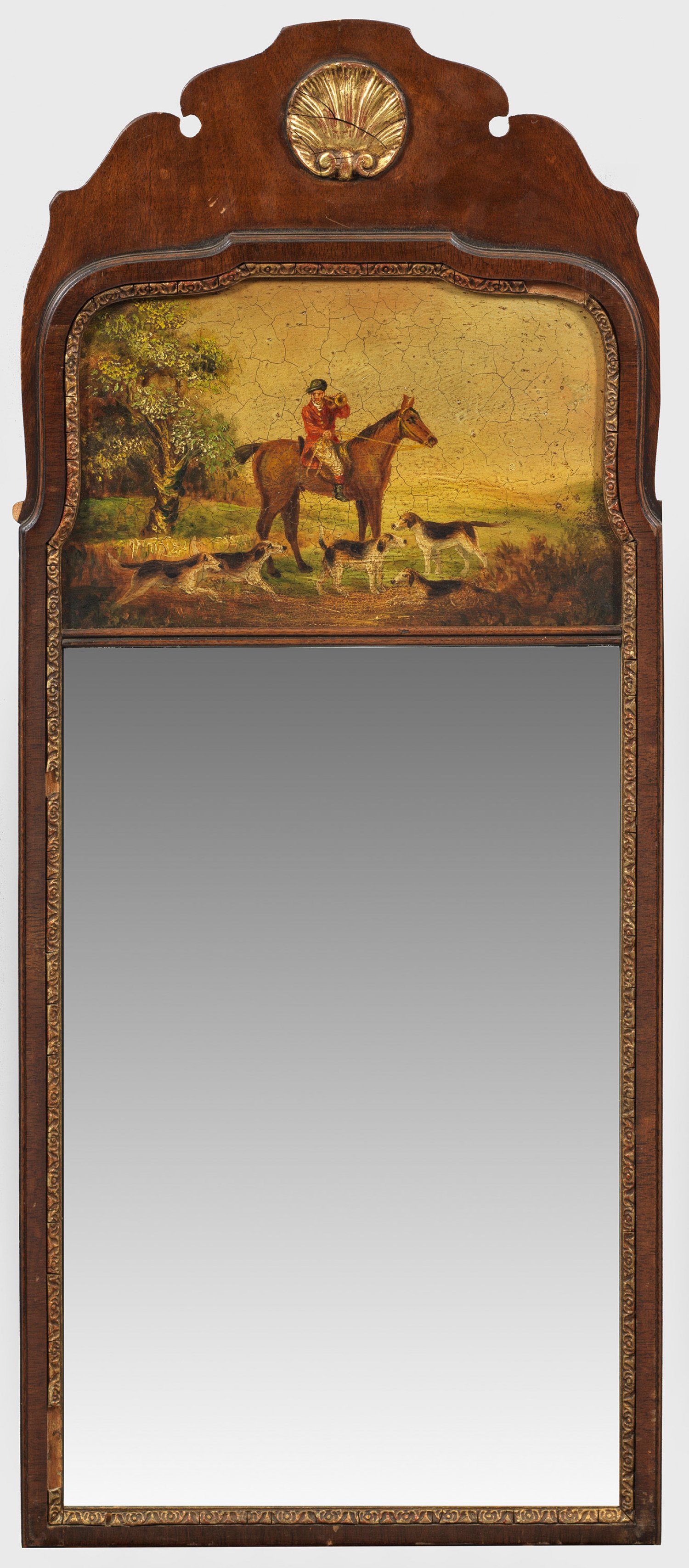 Mahagoni, furniert. Gerade, hochrechteckige Spiegelrahmung aus schmalen Profilen. Breites Giebelfeld mit geschweiftem oberen Abschluss sowie erhaben reliefierter Jakobsmuschel. Polychrome Darstellung eines Parforcejägers mit Hundemeute. 80 cm x 34 cm.