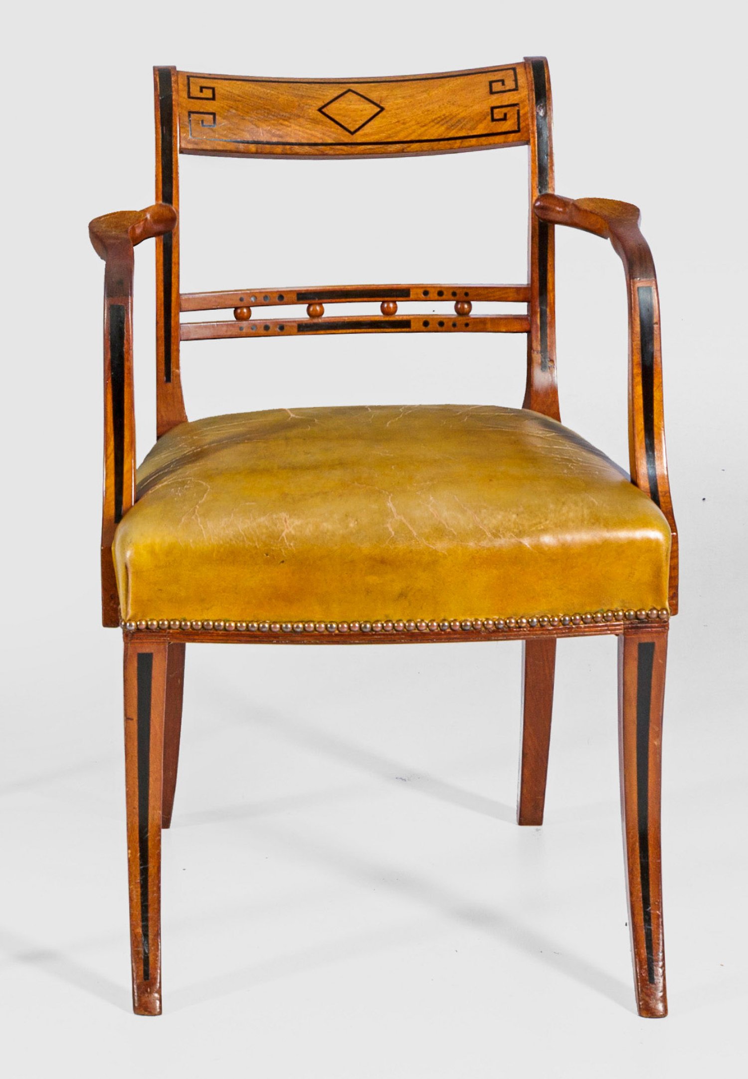 Helles Mahagoni mit Einlagen aus Ebenholz. Trapezförmige Zarge auf gebogten Vierkantbeinen. Schmale, geschwungene Armlehnen mit verbreiteter Armauflage. Offen gestaltete Rückenlehne mit schmalen Mittelstegen. Sitzfläche gepolstert und mit olivgrünem Leder bezogen. Sitz-H. 48 cm.