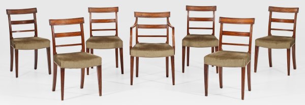 7-tlg.; Armlehnstuhl und sechs Stühle. Mahagoni. Trapezförmige Zarge auf konischen Vierkantbeinen. Geschweifte Streben für schmale Armlehnen sowie rechteckige Rückenlehnenrahmung mit leicht gewölbtem oberen Abschluss. Sitzfläche gepolstert und bezogen. Sitz-H. 44 cm.