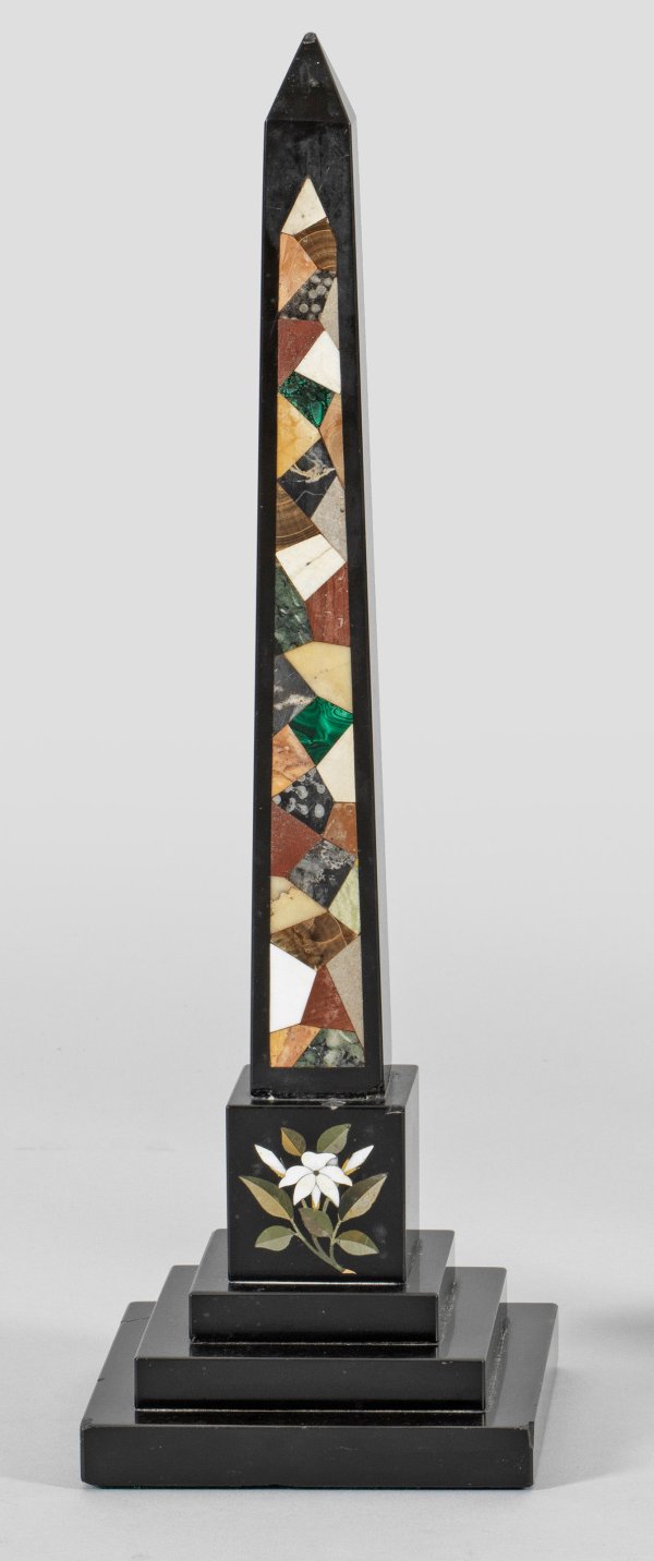 in sog. Pietra Dura-Technik. Sich nach oben konisch verjüngender Schaft über mehrfach gestufter Plinthe. Einlegearbeiten aus verschiedenen Steinen, u. a. in unterschiedlichen Tönen gefärbter Marmor, Malachit sowie Achat. Am Ansatz die feine Darstellung eines Blütenzweiges mit großer, weißer Blüte. Best.; H. 36,5 cm.