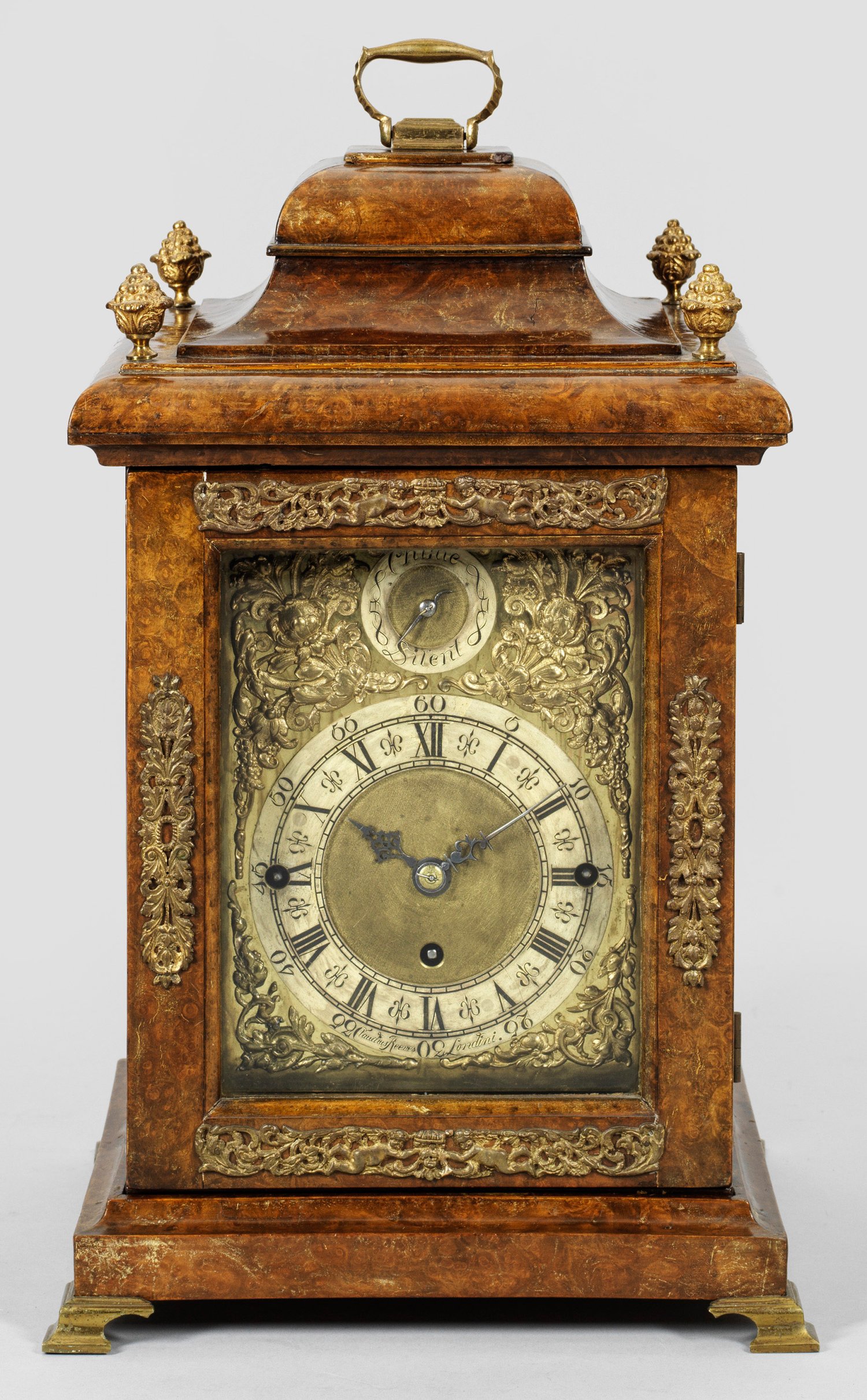 Wurzelnuss, furniert. Gerader, architektonisch gegliederter Korpus, seitlich mit durchbrochen gearbeitetem Gitterwerk auf flachem Sockel mit geschweift ansteigendem oberen Abschluss und Balusterbekrönungen. Reliefiertes Zifferblatt mit Schlagabsteller, bez. "Claudius Reeves, London". Werk mit Viertelstundenschlagwerk auf fünf Tonfedern sowie sog. Carillon aus acht Glocken. H. 47 cm. 27 cm x 27 cm.