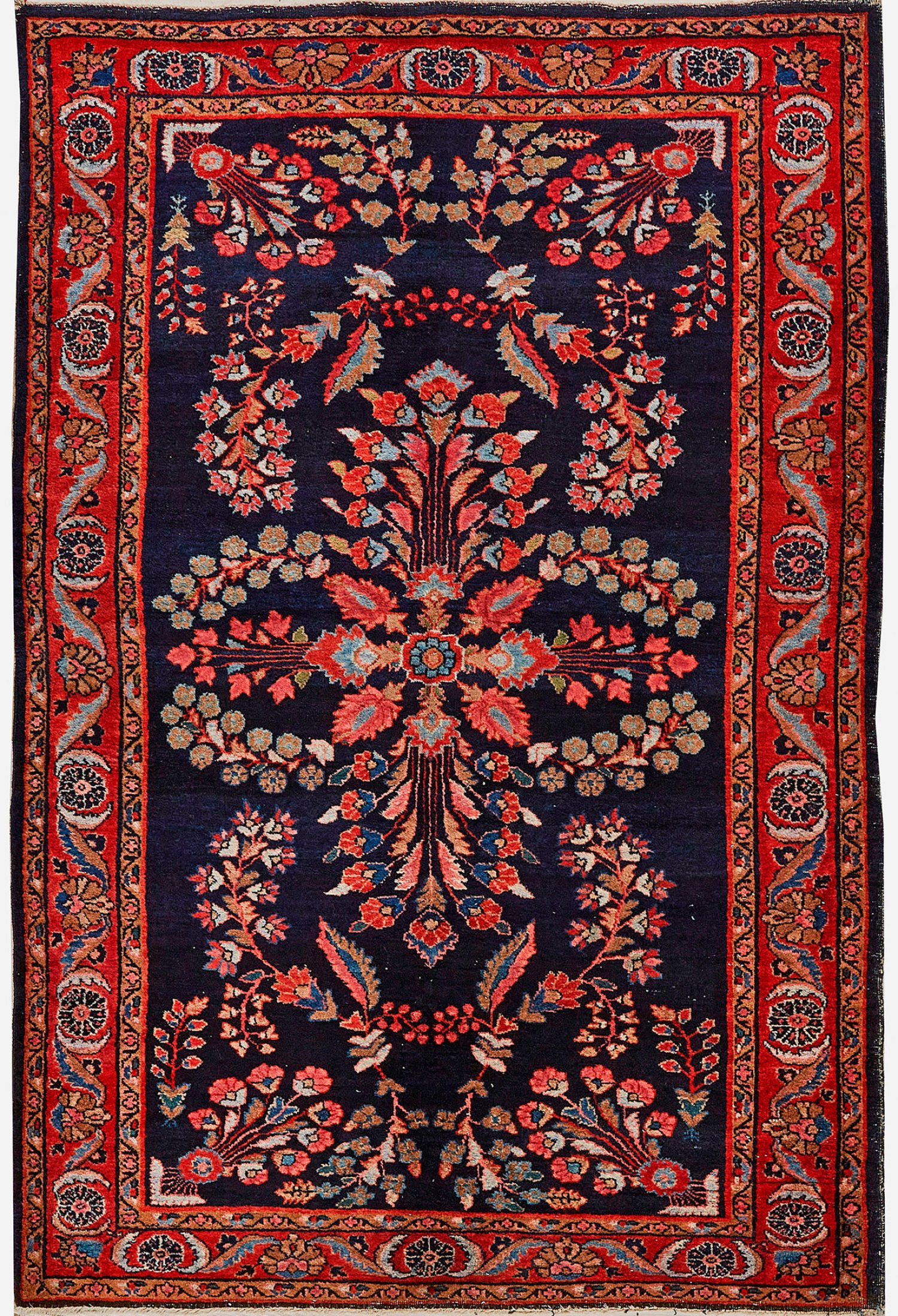 Persien. Mitte 20. Jh.; Wolle auf Baumwolle. Auf tintenblauem Fond großflächige, ornamental angelegte Musterung aus üppigen Blütenrispen. Umlaufend rotgrundige Bordüre aus Rosetten und Blattwerk, flankiert von schmalen Bändern. 194 cm x 130 cm.