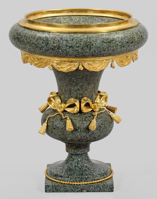 Grün gemaserter Serpentin und vergoldete Bronze. Balusterförmiger, tief eingezogener Korpus mit Perlstabfries sowie kräftigem, weit ausladendem Lippenrand mit umlaufender Profilierung. Unterhalb reliefplastisch gestaltetes Draperiewerk sowie umlaufend der Wandung Dekorationen aus großen Schleifenmotiven mit Quastenabschlüssen. Bez. BY. H. 56 cm.