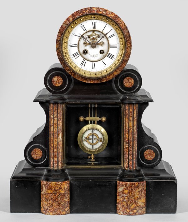 Schwarzer bzw. rot-braun gemaserter Marmor. Über rechteckigem Sockel architektonisch gegliedertes Gehäuse, flankiert von Volutenmotiven. Oberhalb profilgerahmtes Zifferblatt, bez. "Levi, Paris". Werk mit sichtbarer Ankerhemmung sowie Halbstundenschlag auf Glocke. H. 48 cm. 38,5 cm x 15 cm.