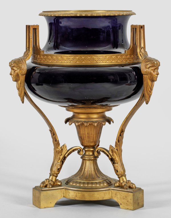 Keramik mit kobaltblauem Fond und Messing, patiniert. Balusterförmiger Korpus auf stark geschwungenen Streben mit Maskarons, in gekantete Henkel übergehend. Unterhalb gegliederter Balusterschaft und flache Sockelplatte. Minim. best. H. 48 cm.