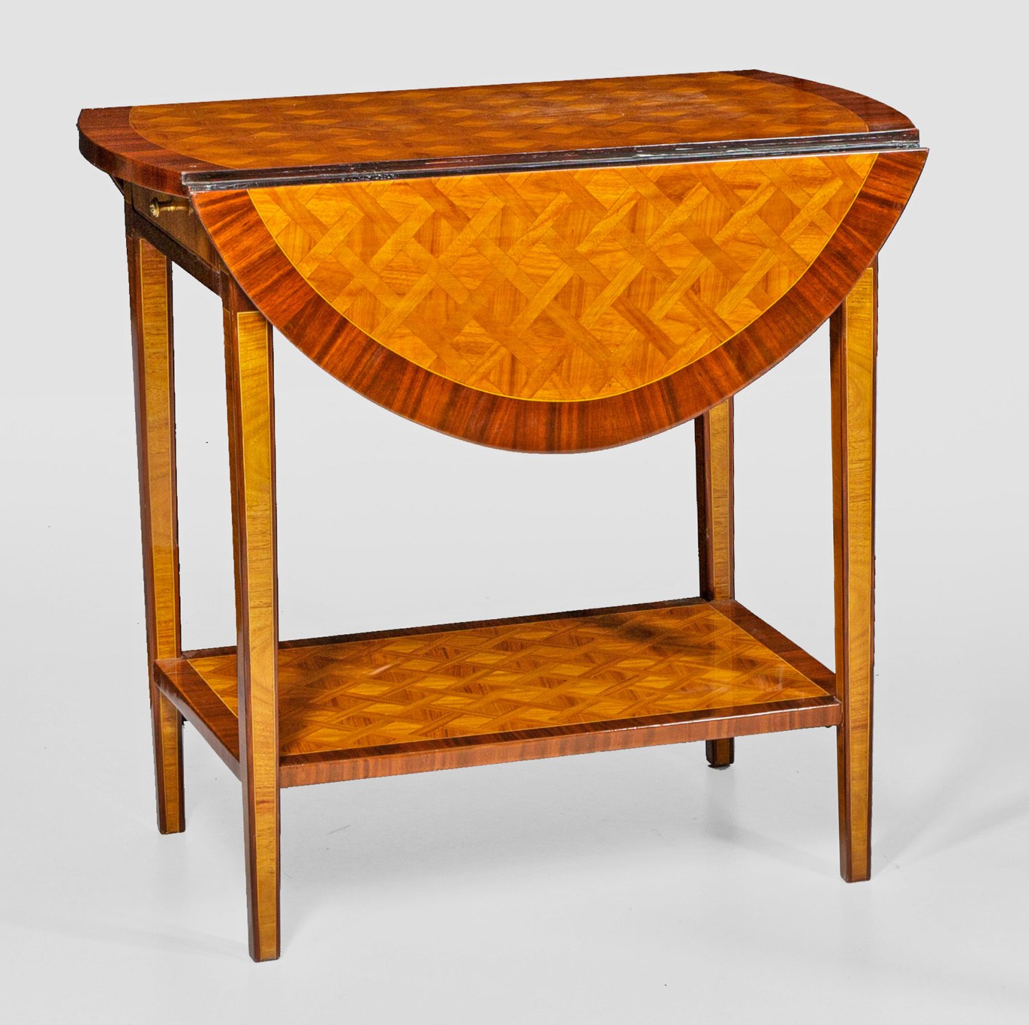 Nussbaum und Rosenholz, furniert. Gerader, einschübiger Zargenkasten auf konischen Vierkantbeinen, unterhalb durch rechteckiges Ablagefach verbunden. Überstehende, gerundete, seitlich aufstellbare Deckplatte. Flächendeckende Furnierfelder aus Gitterwerk. H. 70 cm. 75 cm x 47/92 cm.