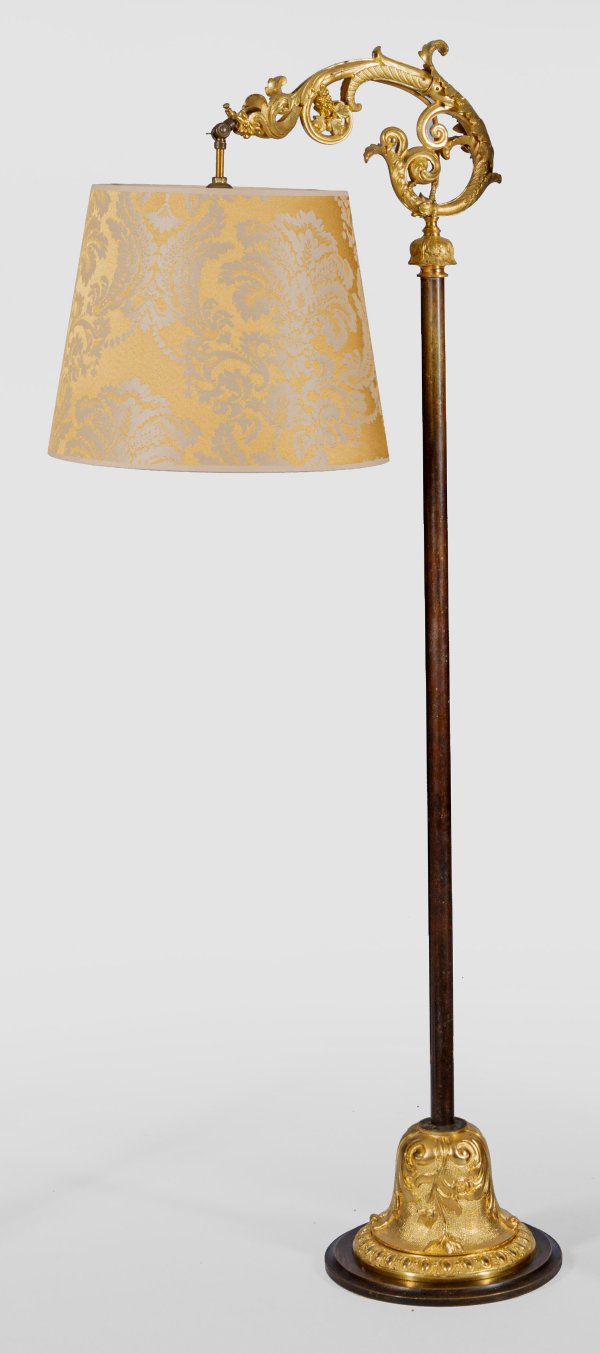 1-flg.; Bronze, vergoldet sowie teilw. patiniert, über gestuft ansteigendem Rundsockel mit breitem Eierstabfries und reliefierten Voluten. Oberhalb davon ausgehend schlanker Rundschaft sowie großes, durchbrochen gearbeitetes Volutenmotiv als Träger für Leuchtmittel mit konischem Lampenschirm. Elektrifiziert. H. 145 cm.