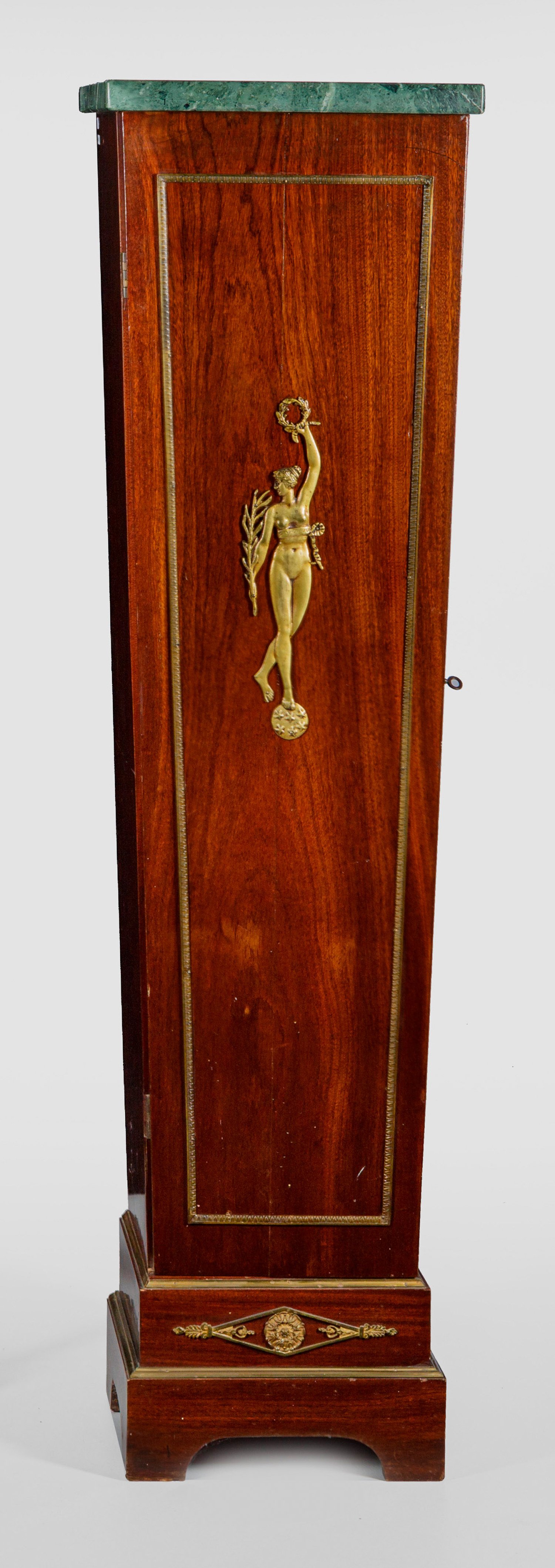 Mahagoni, furniert. Auf gestuft ansteigendem Profilsockel sich konisch weitender, eintüriger Korpus mit Palmettenfries und applizierter Viktoria aus Bronze. Rechteckige Deckplatte aus grün gemasertem Marmor. H. 146 cm. 39 cm x 31 cm.