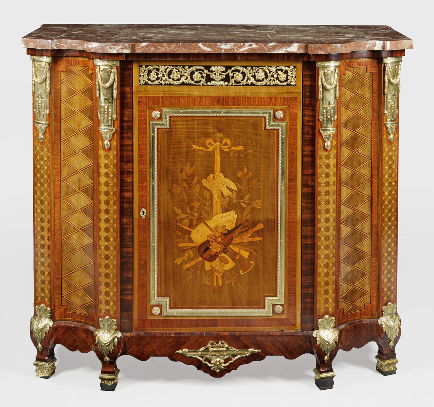 Rosenholz, furniert sowie flächendeckende Marketerie aus unterschiedlichen, teilw. grün gefärbten Edelhölzern. Reiche Applikationen und Profile aus vergoldeter Bronze. Gerader, querrechteckig angelegter, zu den Seiten konkav eingezogener Korpus, flankiert von breiten Lisenen auf Profilzarge und kurzen Balusterfüßen. In der gegliederten Front profilgerahmte Tür mit intarsierten Attributen der Musik. Korrespondierende Furnierfelder aus Gitterwerk sowie breiter Fries aus eingerollten Blattvoluten. Dem Korpus entsprechende Deckplatte aus rotem, weiß gemasertem Marmor. H. 113 cm. 127,5 cm x 61 cm.