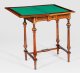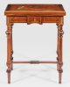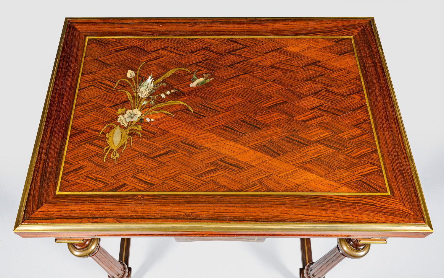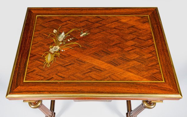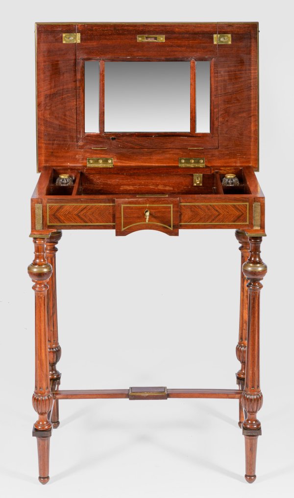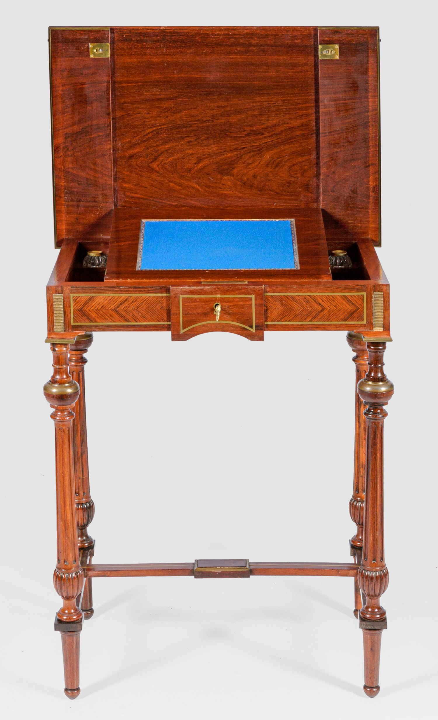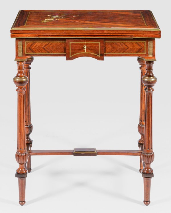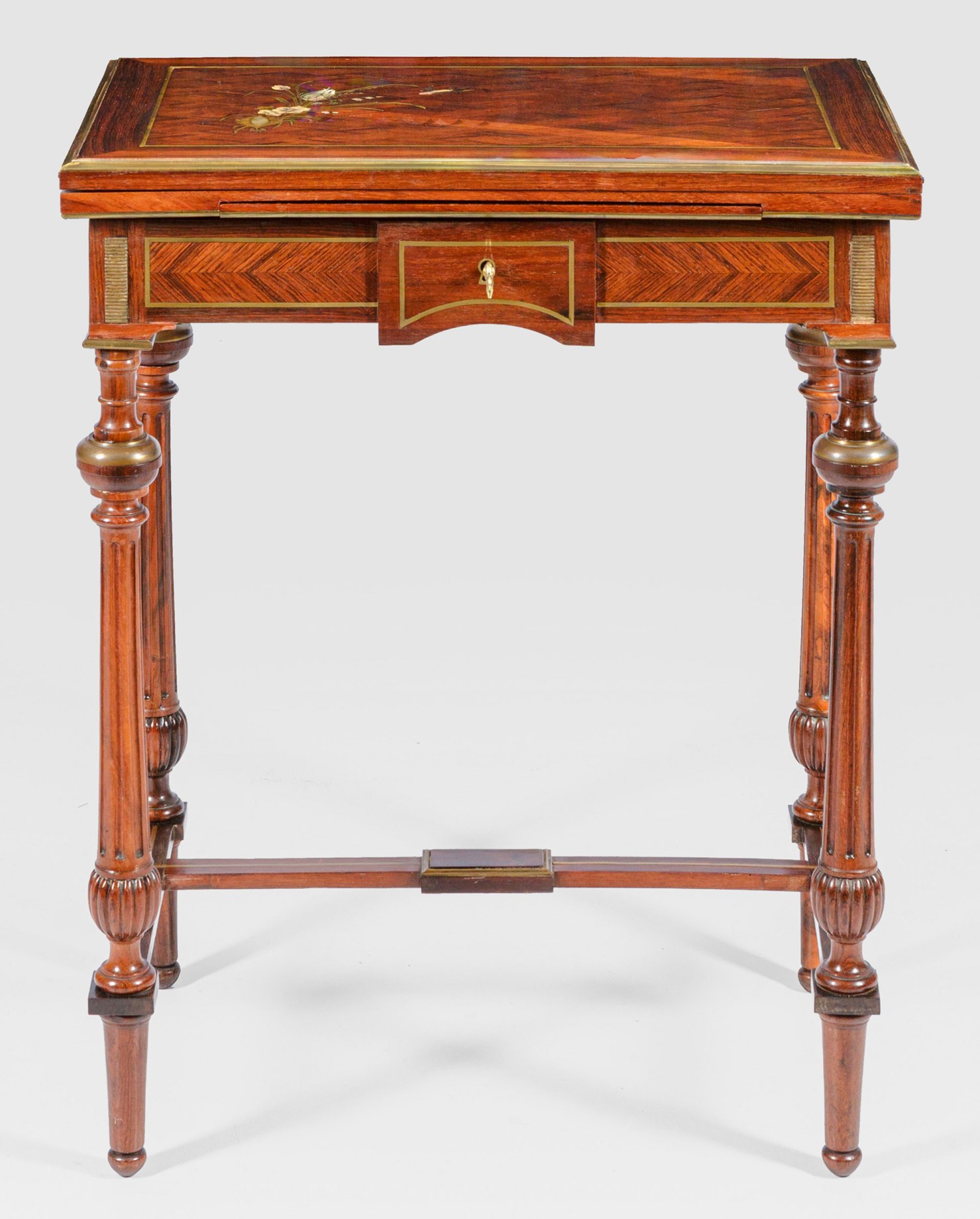 Palisander furniert sowie Einlagen aus Messing und Perlmutter. Gerader Zargenkasten auf schlanken, mehrfach gegliederten Balusterbeinen, unterhalb durch schmale Stege verbunden. Gering überstehende, aufklappbare bzw. aufstellbare Deckplatte mit eingelegter Spielfläche aus grünem Filz sowie eingelassener und abklappbarer Spiegelfläche. Rückseitig eingelegte Arbeitsfläche. Unterhalb Einteilung mit Glasgefäßen für Tinte und Streusand. Flächendeckend gerahmte, gespiegelt angeordnete Furnierfelder, teilw. aus Rautenmarketerie sowie auf der Platte große Floraleinlage und kleiner Vogel. H. 76 cm. 60 cm x 40 cm bzw. 80 cm x 60 cm.