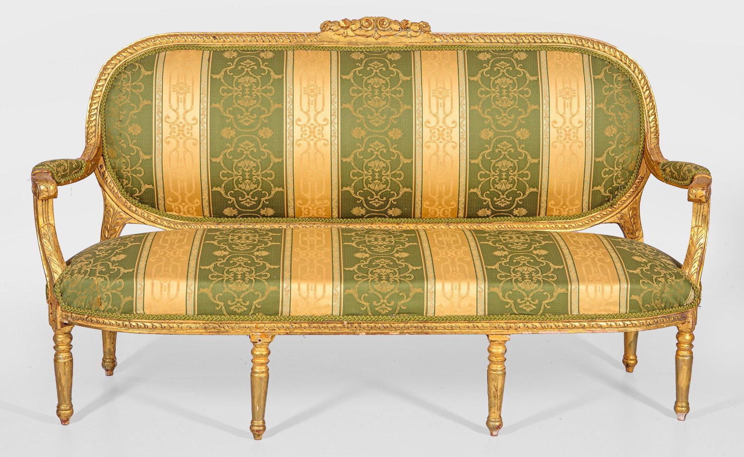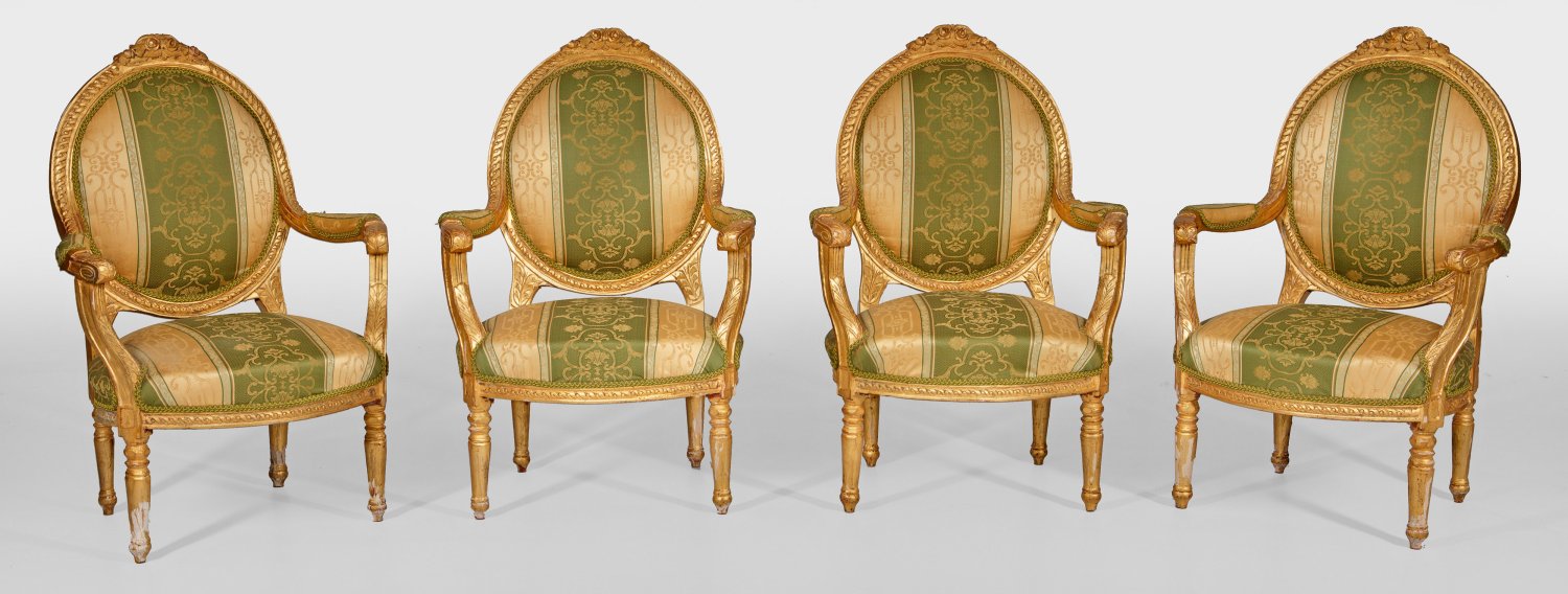 5-tlg.; Canapé und vier Armlehnsessel. Holz, reliefiert und vergoldet. Bombierte Profilzarge auf gegliederten Balusterbeinen. Blattreliefierte Streben für schmale Armlehnen, in gewölbte bzw. medaillonförmige Rückenlehnenrahmung mit Rosenbekrönung übergehend. Gepolstert und bezogen. Altersspuren. Sofa-H. 101 cm. 179 cm x 55 cm. Sitz-H. 42 cm.