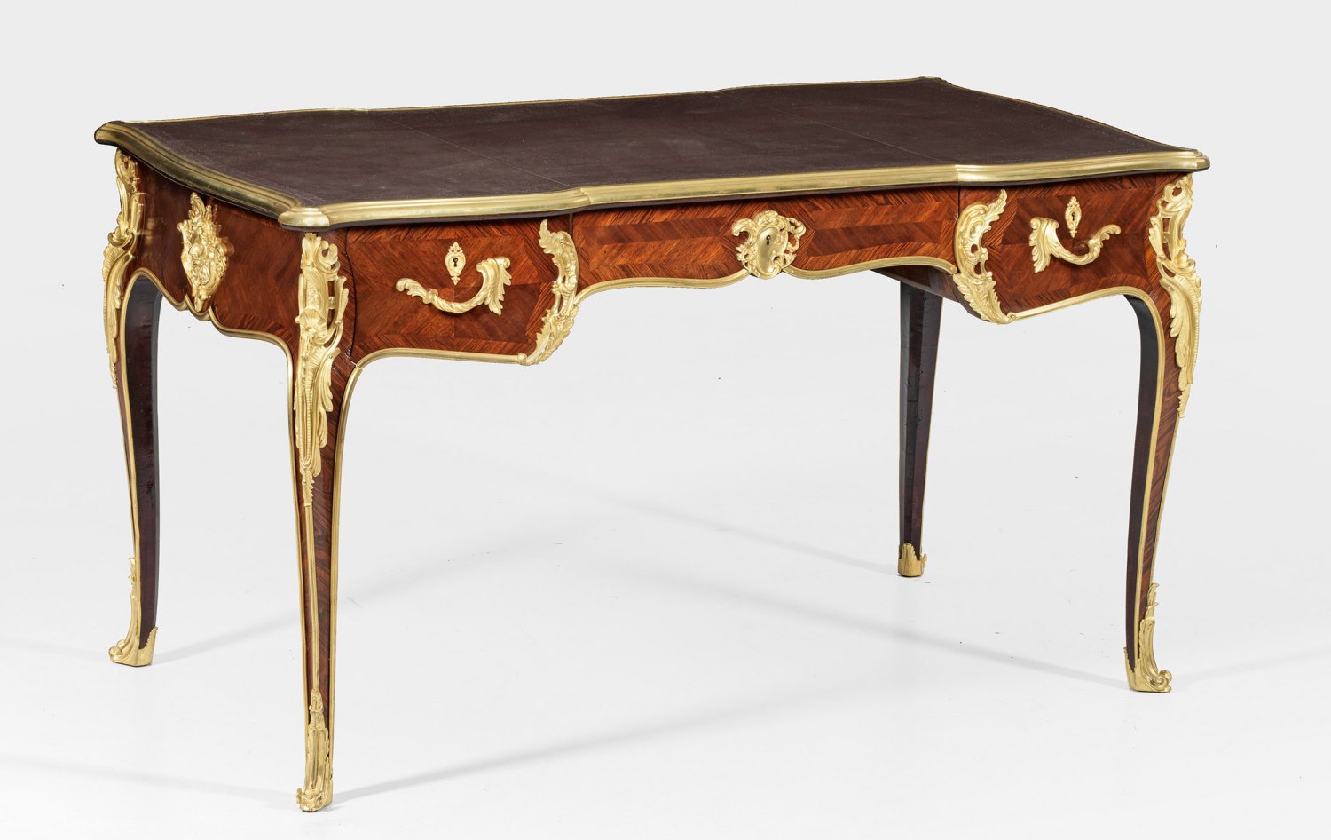 Palisander und Mahagoni, furniert sowie fein zilisierte Applikationen aus vergoldeter Bronze. Passig geschweifte und umlaufend profilierte Zarge auf leicht geschweiften Beinen. In der gegliederten Front drei Schubladen unterschoiedlicher Größe sowie rückseitig entsprechende Blendschubladen. Fein gearbeitete Griffe aus Blattwerk sowie korrespondierende, durchbrochen gearbeitete Applikationen. Seitlich reliefplastisch gestaltete Maskarons. Verdeckter Schlagstempel "G.G." im, Oval. Korrespondierende, gering überstehende, profilgerahmte Deckplatte mit Arbeitsfläche aus geprägtem Leder. Schloss rücks. bez. Duvivier Paris. H. 76 cm. 135 cm x 74 cm.