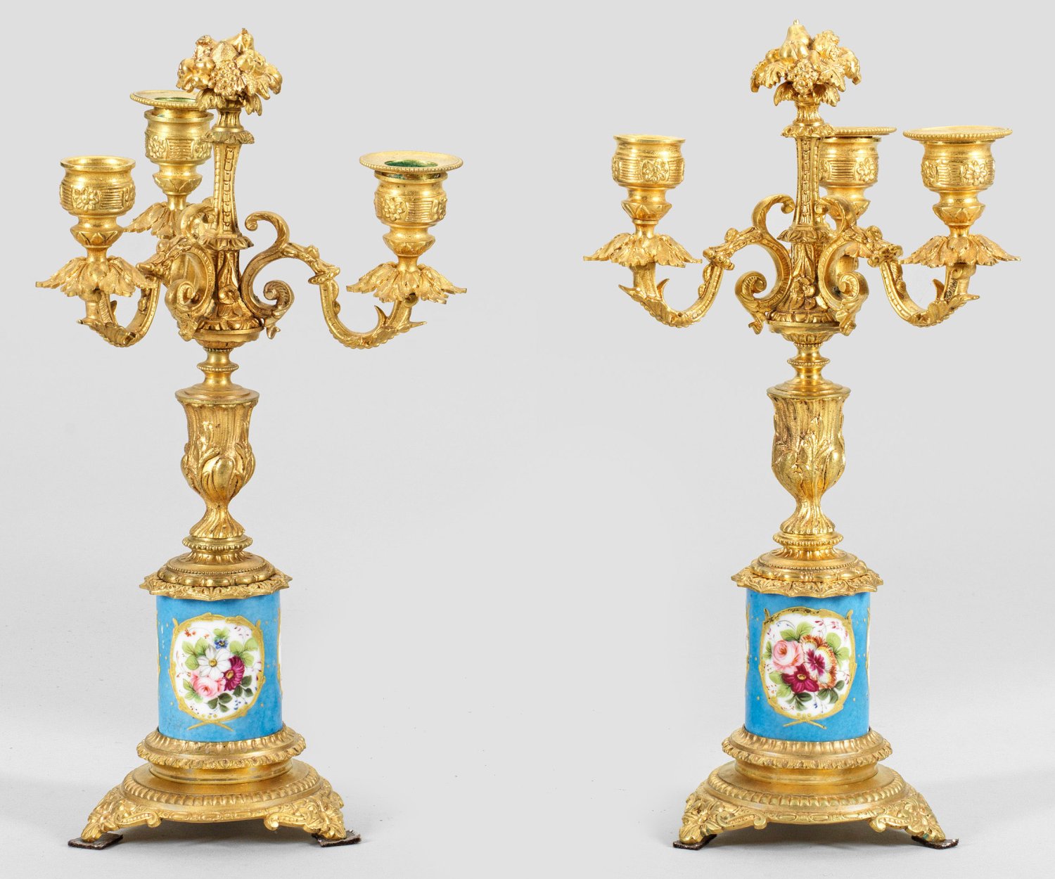 3-flg.; Bronze, vergoldet sowie polychrom gestaltete Sèvres-Porzellaneinsätze. Zylinderförmige Basis mit großen, blütengefüllten Reserven auf hellblauem Fond auf gestuft ansteigendem Sockel. Oberhalb gegliederter Balusterschaft mit volutenförmigen Leuchterarmen und vasenförmigen Tüllen. Zwei Tülleneinsätze fehlen. H. 34,5 cm.