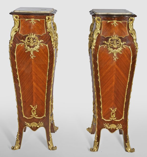 Mahagoni, furniert sowie reiche Applikationen aus vergoldeter Bronze. Allseitig bombierter Korpus, flankiert von schlanken Ecklisenen, in ausgestellte Beine übergehend. Allseitig breit gerahmte, gespiegelt angeordnete Furnierfelder, begrenzt von blattreliefierten Profilen. Profilierte Deckplatte aus cremefarben gemasertem Marmor. H. 132 cm. 40 cm x 40 cm.