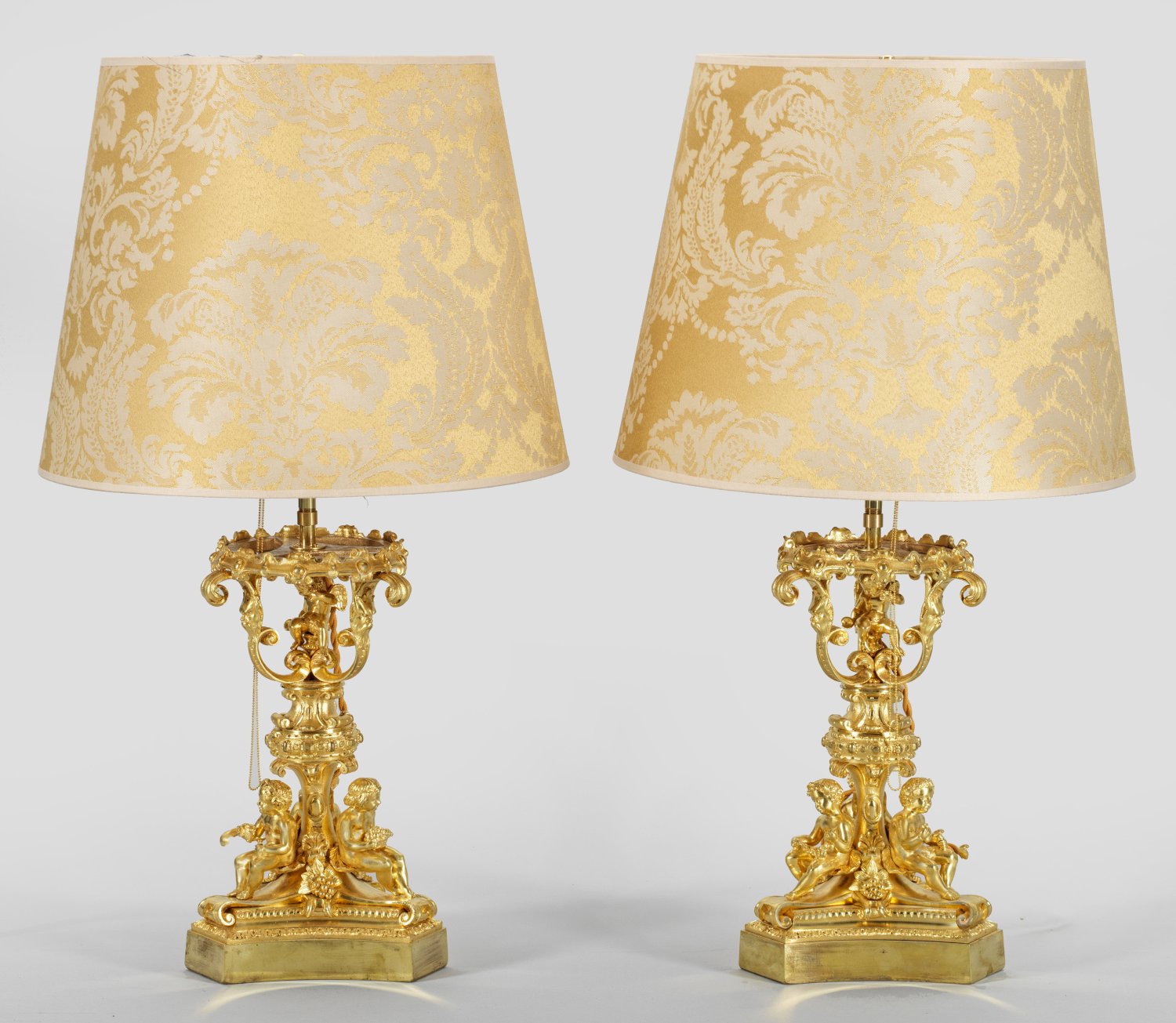 2-flg.; Bronze, vergoldet. Über dreiseitig konkav eingezogenem Sockel mit Palmettenfries üppige Volutenmotive in mehrfach gegliederten Balusterschaft übergehend, flankiert von musizierenden Puttenkindern. Oberhalb gegeneinandergestellte Volutenelemente sowie profilierter Nodus als Träger für schlanken Schaft mit Leuchtmitteln, nachträglich als Lampe montiert. Konischer Lampenschirm. H. 68 cm.