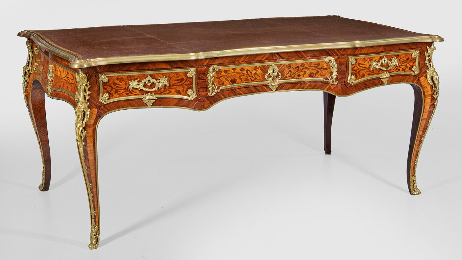 Palisander und Rosenholz, furniert sowie reiche, durchbrochen gearbeitete Applikationen aus vergoldeter Bronze. Passig geschweifter Zargenkasten, flankiert von konkav eingezogen Ecklisenen, in geschwungene Beine übergehend. In der gegliederten Front geschweiftes Kniefach sowie drei profilgerahmte Schubladen unterschiedlicher Größe. Rückseitig korrespondierende Blendschubladen. Flächendeckend gespiegelt angeordnete Furnierfelder mit intarsierten Blüten. Allseitig dekorative Profile und Rocailleapplikationen. Passig geschweifte, profilgerahmte Deckplatte mit flächendeckender Arbeitsfläche. H. 79,5 cm. 179 cm x 96 cm.