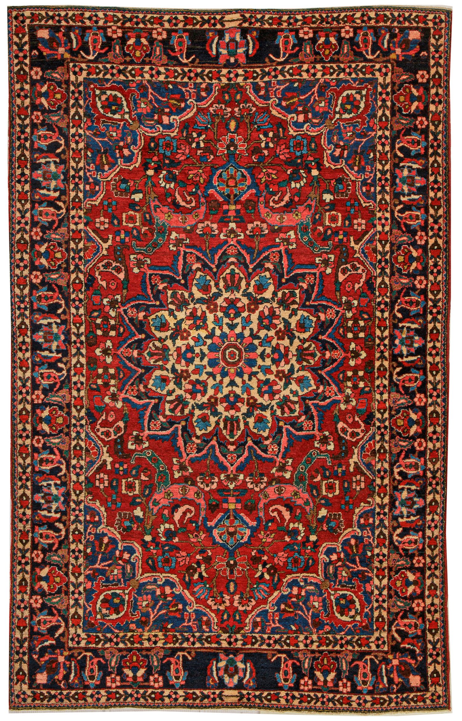 Persien. Wolle auf Baumwolle. Im roten Innenfeld großes, zentral angeordnetes Rundmedaillon sowie passig geschweifte Ecklösungen mit großen Palmetten. Flächendeckende Blütenmusterung. Umlaufend dunkelgrundige Bordüre aus Blattranken, flankiert von schmalen Blütenbändern. 137 cm x 221 cm.