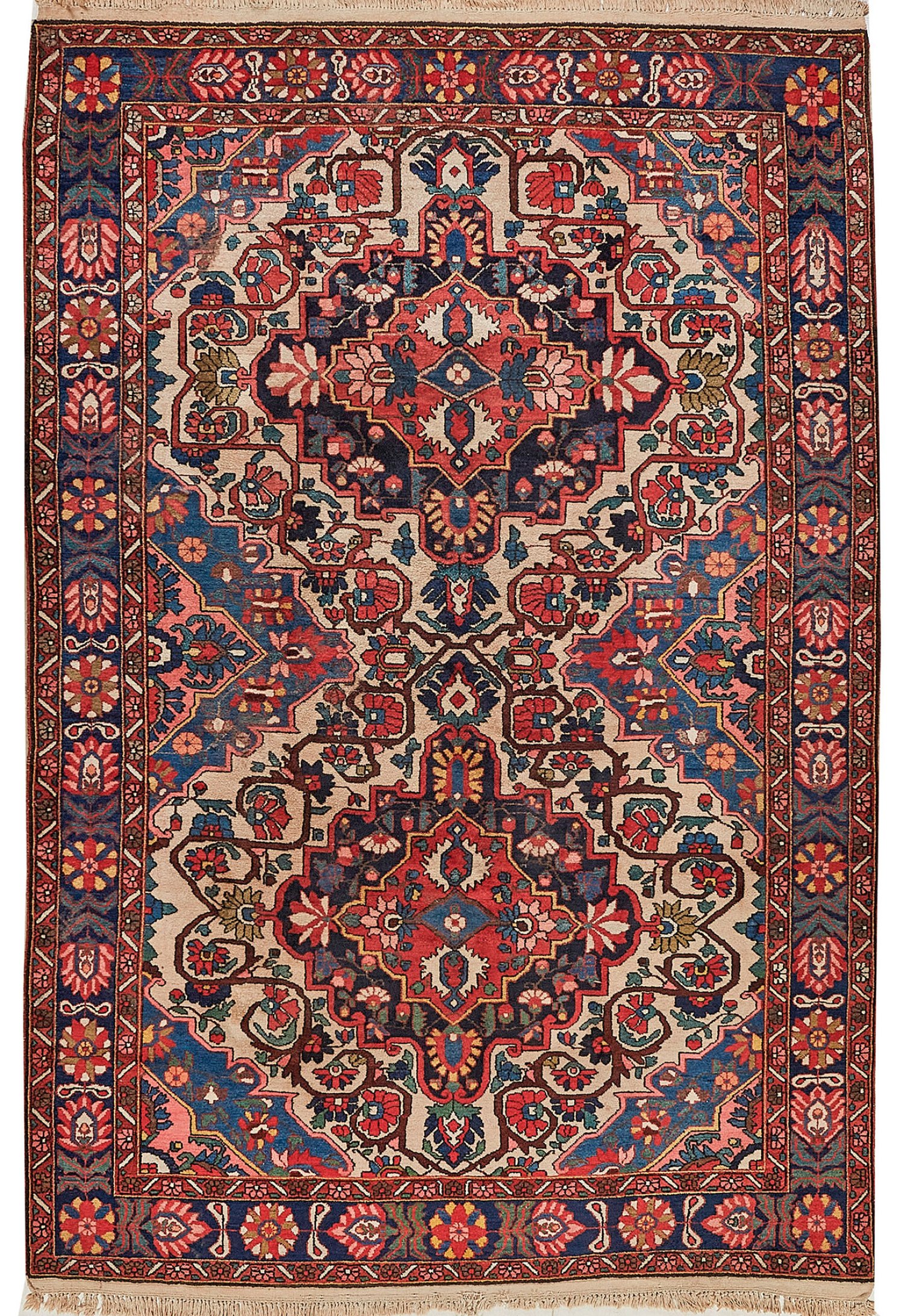 Persien. Mitte 20. Jh.; Wolle auf Baumwolle. Im Innenfeld zwei große, gestaffelt angeordnete Kartuschenmotive sowie flächendeckende Musterung aus Blütenranken und stilisierten Palmetten. Umlaufend breite, korrespondierende Bordüre auf dunklem Fond. 203 cm x 308 cm.