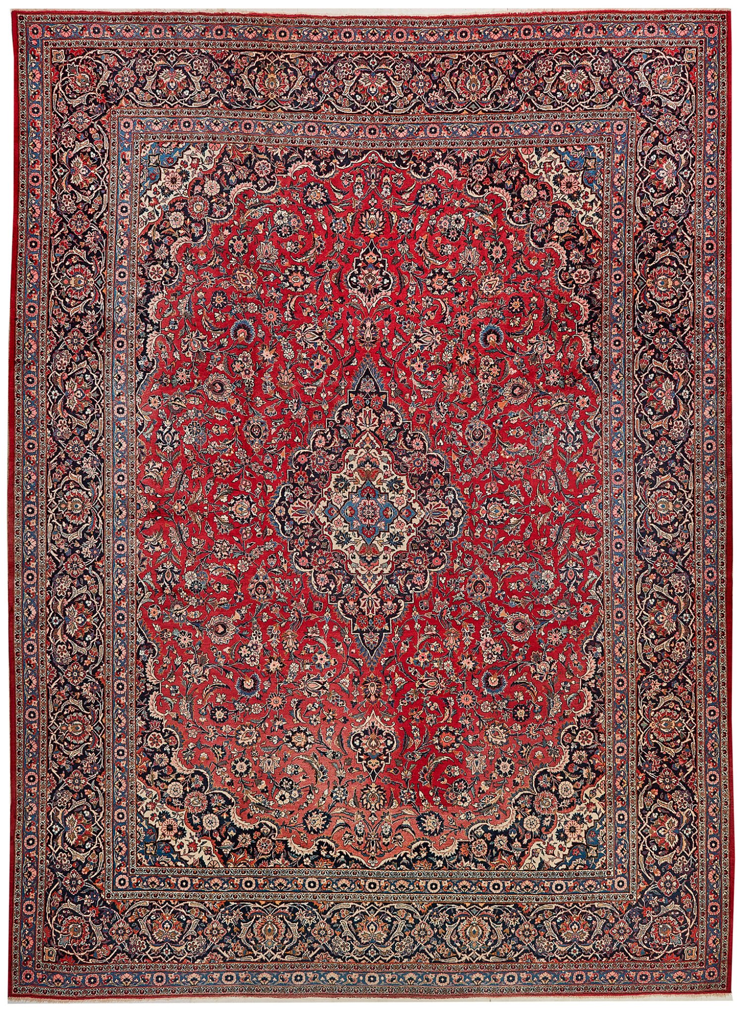 Persien. Wolle auf Baumwolle. Im roten Innenfeld Zentralmedaillon mit Anhängern sowie passig geschweifte Ecklösungen in Dunkelblau. Flächendeckende Musterung aus dichten Blütenranken. Umlaufend breite, dunkelblaue Bordüre aus Palmettenranken. 420 cm x 308 cm.