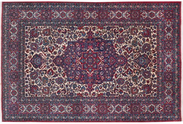 Persien. Mitte 20. Jh.; Wolle auf Baumwolle. Im elfenbeinfarbenen Innenfeld großes, gestaffelt angeordnetes Zentralmedaillon mit Anhängern sowie flächendeckende Musterung aus großzügig angelegten Palmettenranken. Umlaufend breite, rotgrundige Bordüre aus Reserven und Rosetten, flankiert von schmalen Nebenbordüren. 205 cm x 310 cm.