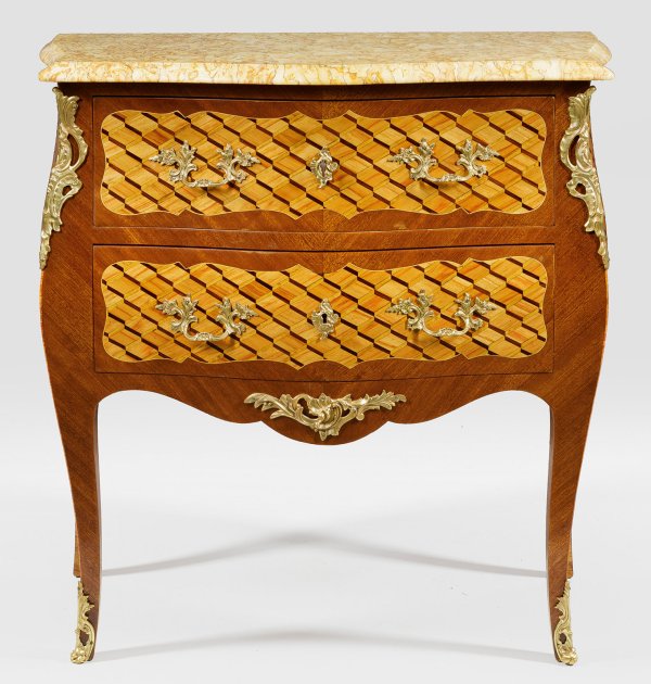 Mahagoni und Rosenholz, furniert. Dreiseitig bombierter Korpus, flankiert von schmalen Ecklisenen, in hohe, leicht geschweifte Beine übergehend. In der gegliederten Front zwei Schubladen. Flächendeckend breit gerahmte, kartuschenförmige Furnierfelder aus Rautenmarketerie. Gering überstehende, profilierte Deckplatte aus cremefarben gemasertem Marmor. Schlagstempel "F DAIDE". H. 85 cm. 85 cm x 40 cm.