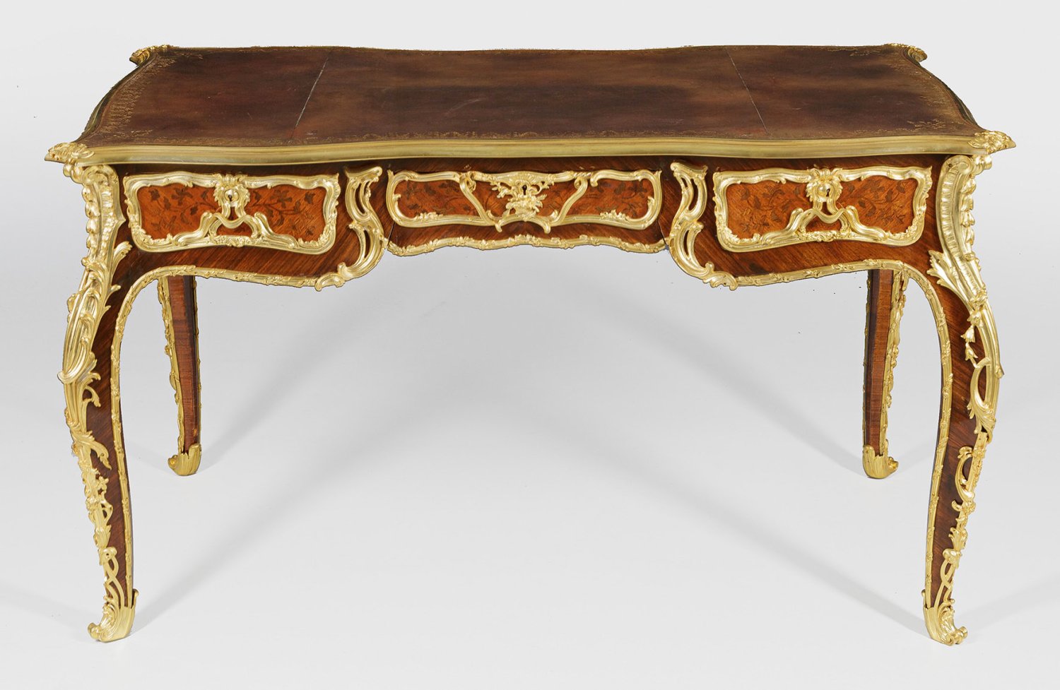 Palisander, furniert sowie reiche, detailliert gearbeitete und fein ziselierte Beschläge aus vergoldeter Bronze. Bombierter, passig geschweifter Zargenkasten mit konkav eingezogenen Lisenen, in geschwungene Beine übergehend. In der gegliederten Front schmales Kniefach sowie drei Schubladen unterschiedlicher Größe. Rückseitig korrespondierende Blendschubladen. Flächendeckend breit gerahmte, gespiegelt angeordnete Furnierfelder mit intarsierten Blattranken, begrenzt von applizierter Rocaillerahmung in korrespondierende Schlüsselschilder und Volutengriffe übergehend. Allseitig floral dekorierte Beschläge sowie üppige Rocailleapplikationen mit Blattwerk. Dem Korpus entsprechende, profilgerahmte Deckplatte mit flächendeckender Bespannung aus schokoladenbraunem, goldgeprägtem Leder. Bronzen teilw. bez. "CVR" (für Victor Raulin?). H. 79 cm. 138 cm x 80 cm.