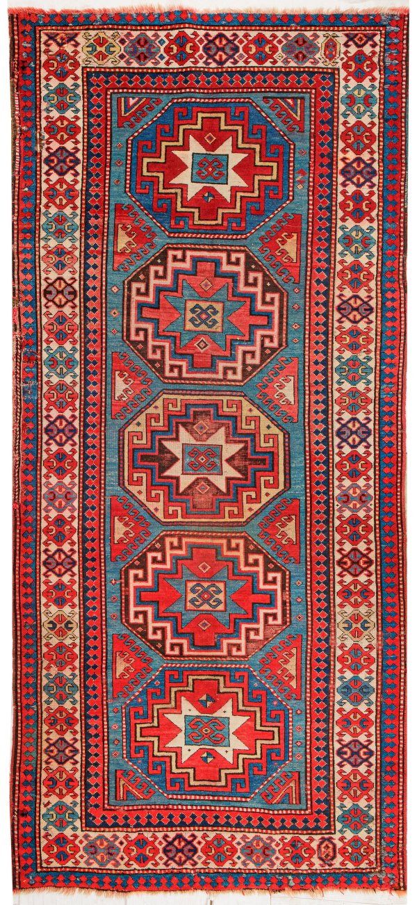 Kaukasus. Wolle auf Wolle. Im hellblauen Innenfeld fünf große, gereihte Rautenmotive in unterschiedlichen Rot-, Gelb-, Blau- und Beigetönen. Umlaufend breite elfenbeinfarbene Ornamentbordüre, flankiert von Zinnenband. Rep.; 310 cm x 146 cm.