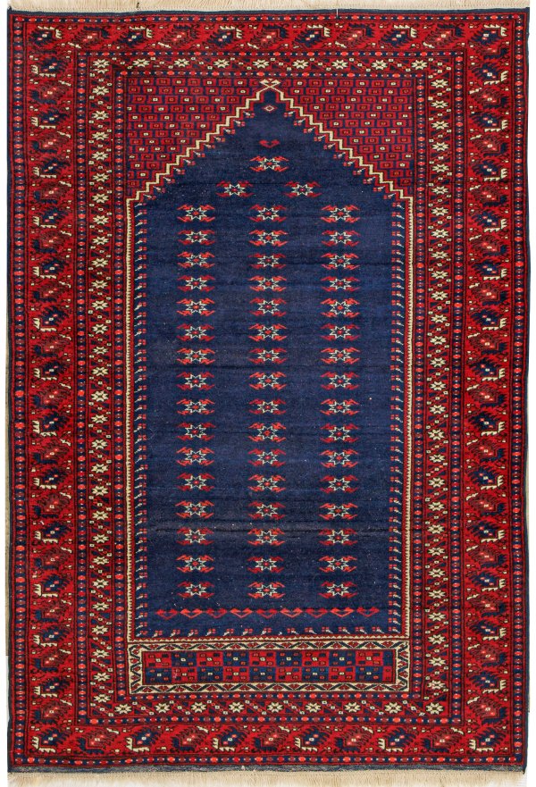 Wolle auf Wolle. Auf blauem Fond gradlinig angelegte Gebetsnische mit gereihten Sternmotiven. Oberhalb Musterung aus gereihten Rautenmotiven im Rapport. Umlaufend breite, rotgrundige Bordüre aus Zackenblättern. 117 cm x 170 cm.