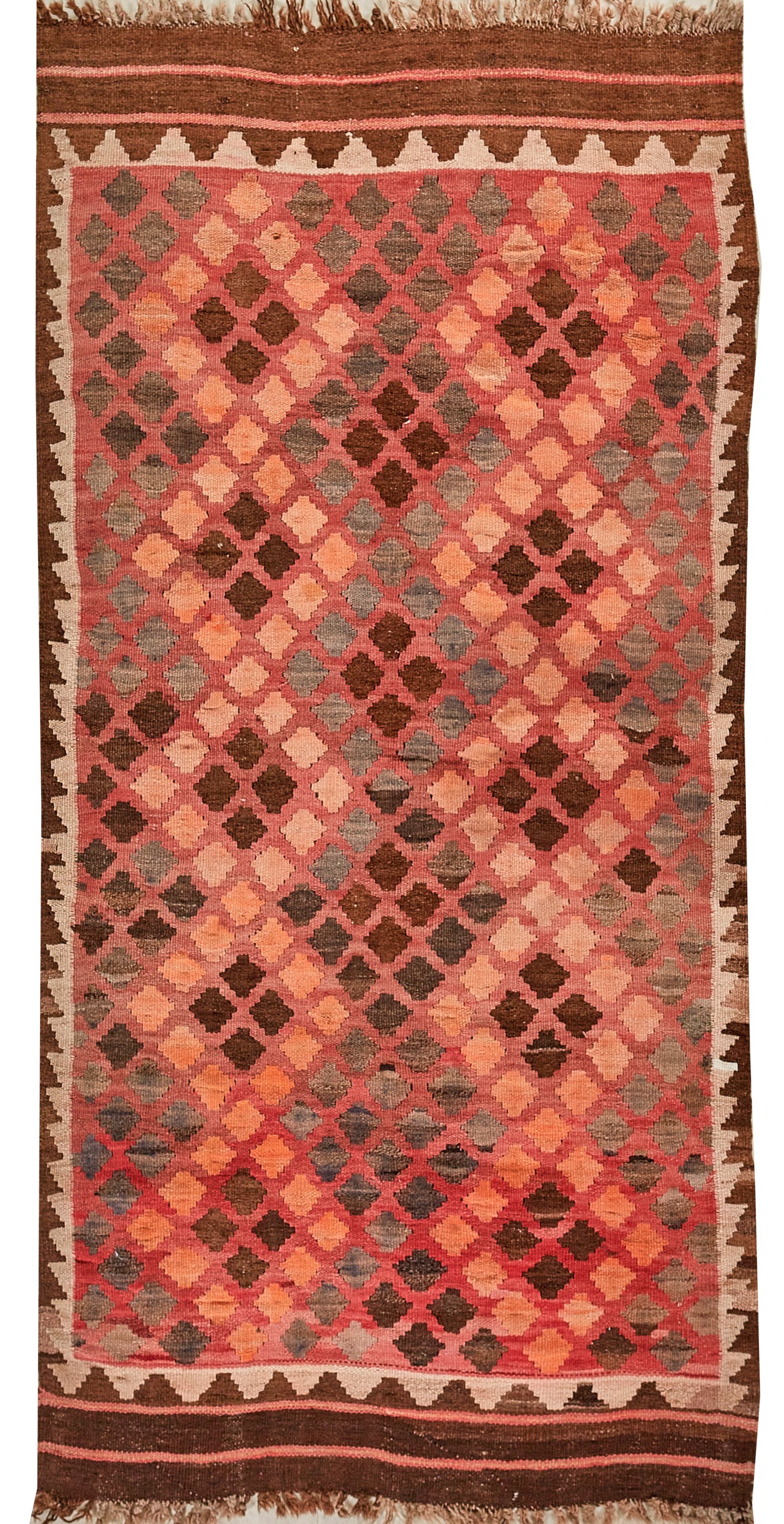 Persien. Um 1940. Wolle auf Wolle, flach gewebt. Im Innenfeld flächendeckende Musterung aus ornamental angeordneten Rautenmotiven in unterschiedlichen Braun- und Orangetönen sowie umlaufend korrepondierende Bordüre. 94 cm x 193 cm.
