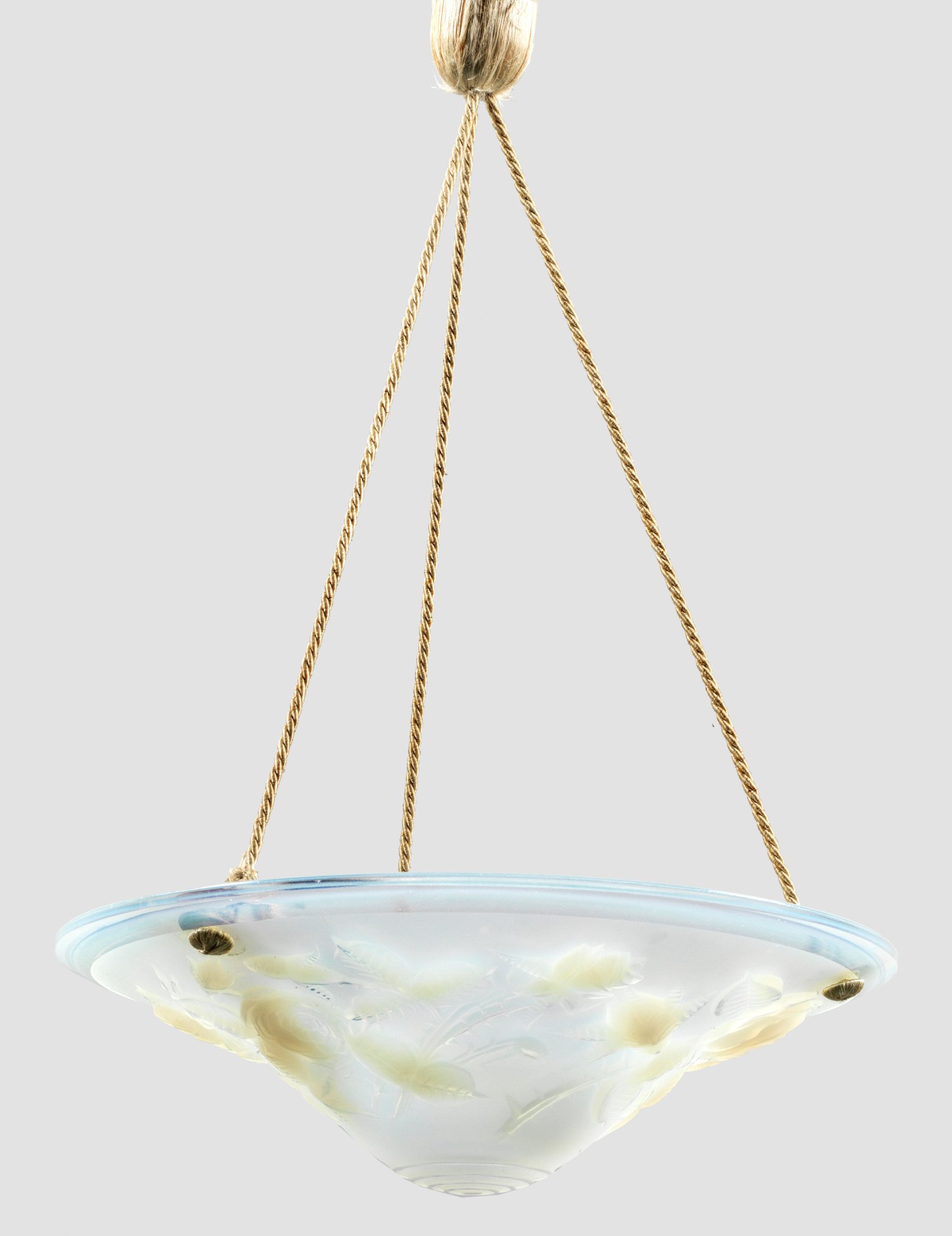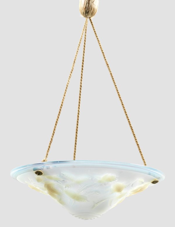 Opalisierendes Glas. Tief gemuldete Lampenschale mit breitem Fries aus erhaben reliefierten Rosenblüten. Im Glas bez. "P. MAYNADIER, FRANCE". Eine Lampenfassung sowie Aufhängung aus Kordelband. Elektrifiziert. Ges.H. 60 cm. D. 40 cm.