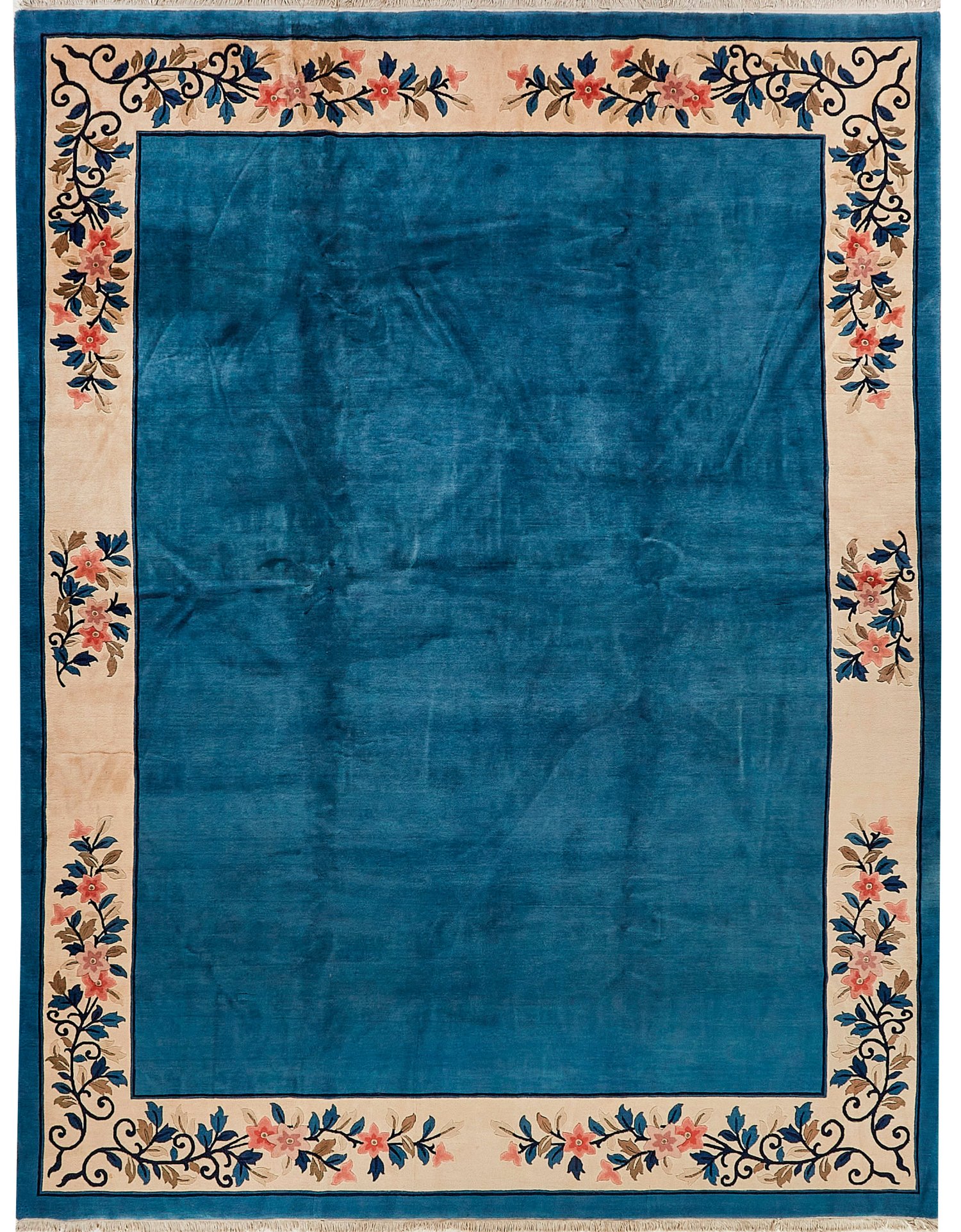 China. Wolle auf Baumwolle. Monochromes, hellblaues Innenfeld. Umlaufend cremefarbene Rahmung mit großen, üppig angelegten Blütenzweigen. 307 cm x 297 cm.