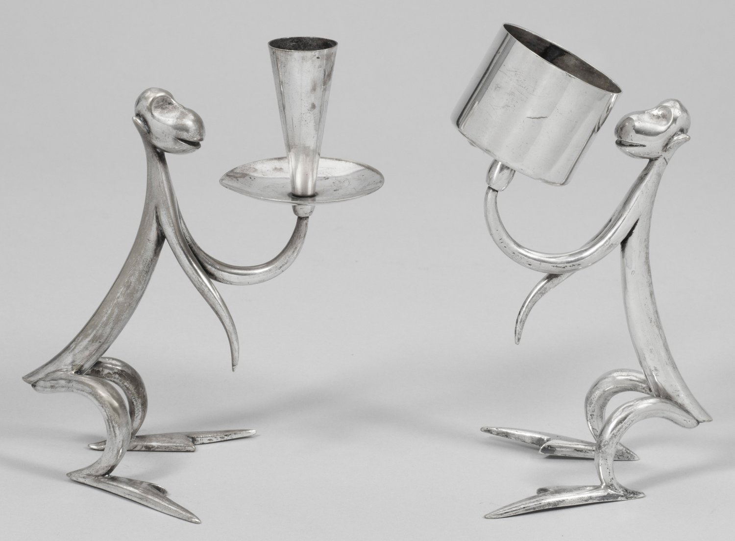Messing, vernickelt. 1-flg. Leuchter. Stilisierte Art Déco-Figuren zweier hockender Affen, jeweils auf dem linken, erhobenen Arm eine konische Tülle mit gemuldeter Traufschale bzw. einen zylindrischen Streichholzbehälter mit geriffelter Reibefläche haltend. Entw. Karl Hagenauer, um 1925-1930. Jeweils gem. "WHW" im Kreis und "MADE IN AUSTREIA". H. 20,5 cm.