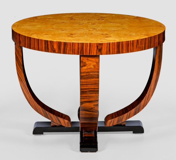 Birkenmaser und Nussbaum, furniert sowie teilw. ebonisiert. Über kreuzförmig angelegten Stegen mit Kugelbekrönung breite gebogte Streben als Träger für runde Deckplatte. H. 58 cm. D. 80 cm.