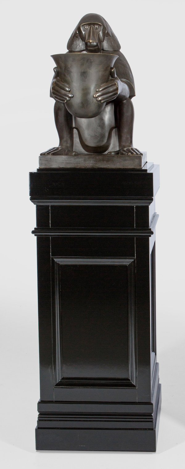 1-flg.; Bronze, patiniert sowie Holz, schwarz lackiert. Vollplastische Darstellung eines hockenden Pavians als Träger für vasenförmiges Leuchtmittel. Elektrifiziert. Gerader, hoher, allseitig profilierter Podestsockel mit quadratischer Deckplatte. Ges.-H. 164 cm. Lampen-H. 60 cm.