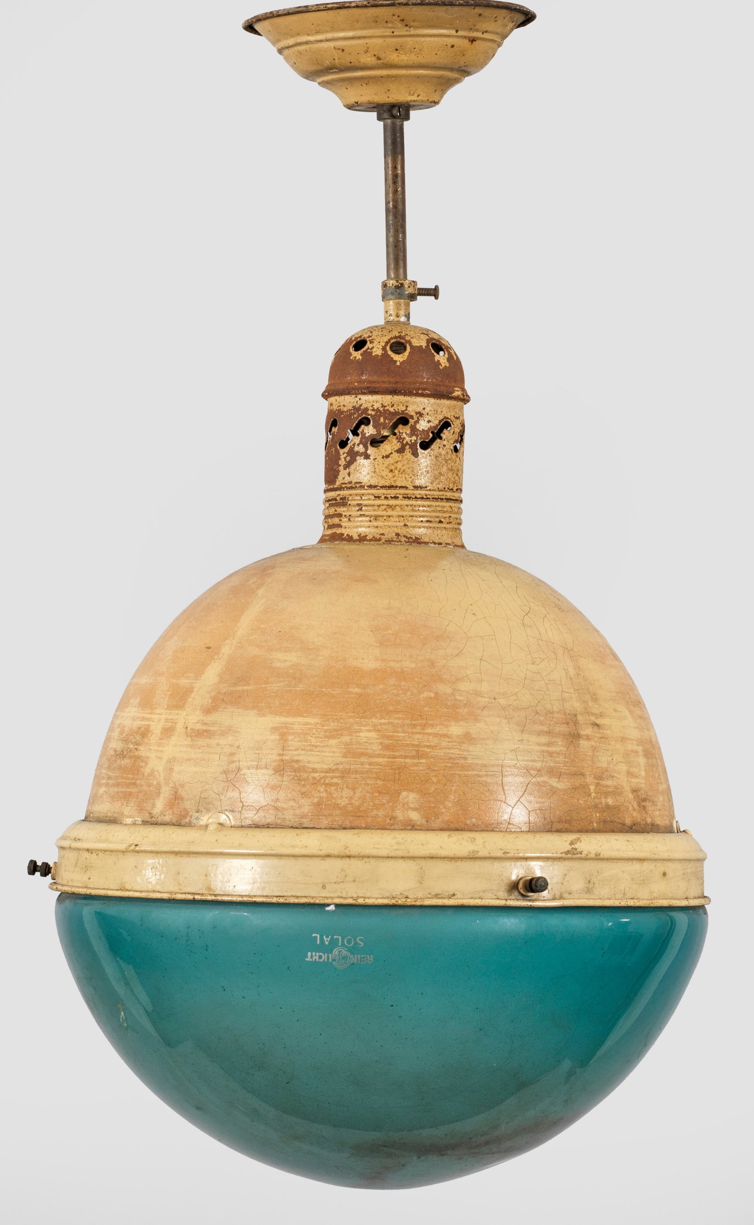 Type E 40. 1-flg.; Metall, cremefarben lackiert sowie blaugrünes Glas. Stark gewölbter Korpus als Träger für flache Kuppel. Durchbrochen gestalteter oberer Abschluss sowie kurzer Schaft als Aufhängung. Spiegelreflektor innen bez. "WISKOTT". Schirm bez. "Rein Licht SOLAL". Neu elektrifiziert. Altersspuren. H. 54 cm.