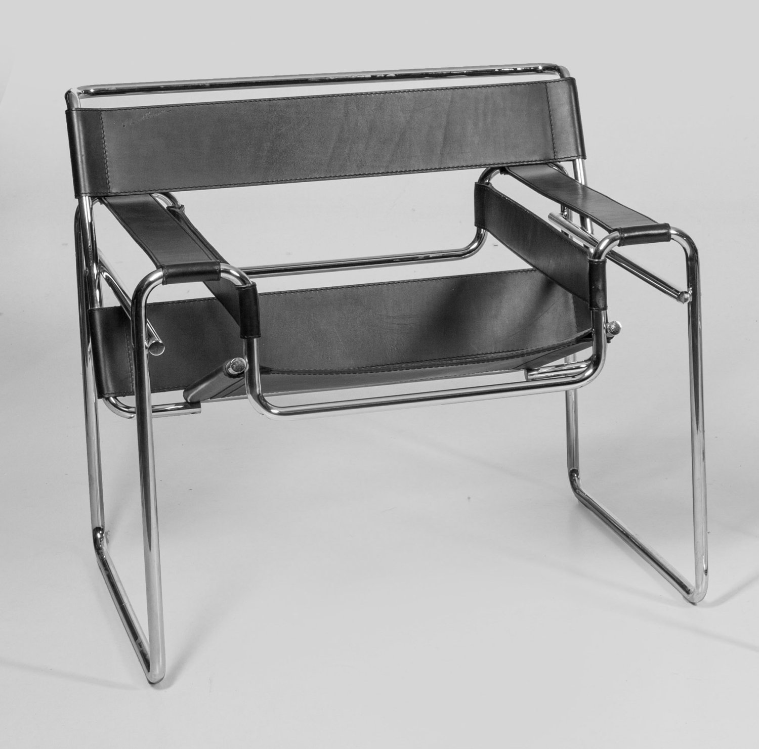 Metall, verchromt und schwarzes Leder. Gestell aus gebogten und ineinander verschraubten Rundstäben. Sitzfläche und Lehnen aus gespannten Ledergurten. Rückenlehne mit geprägter Künstlersignatur sowie unterhalb Quality Control Label.; Entw. Marcel Breuer, um 1925. H. 73 cm. 78 cm x 65 cm. Sitz-H. 41 cm.