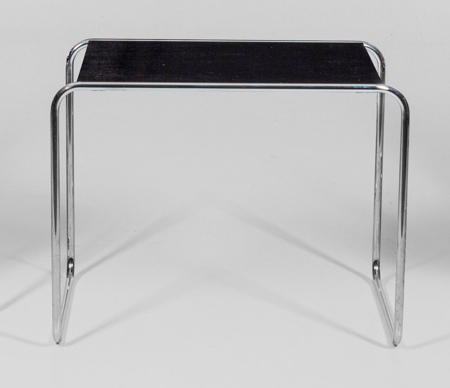 Stahlrohr, verchromt und schwarz gebeiztes Eschenholz. Gestell aus gebogten Rundstäben als Träger für rechteckige Deckplatte. Herstellerzeichen. Entw. Marcel Breuer, 1925/1926. H. 55 cm. 70 cm x 45 cm.