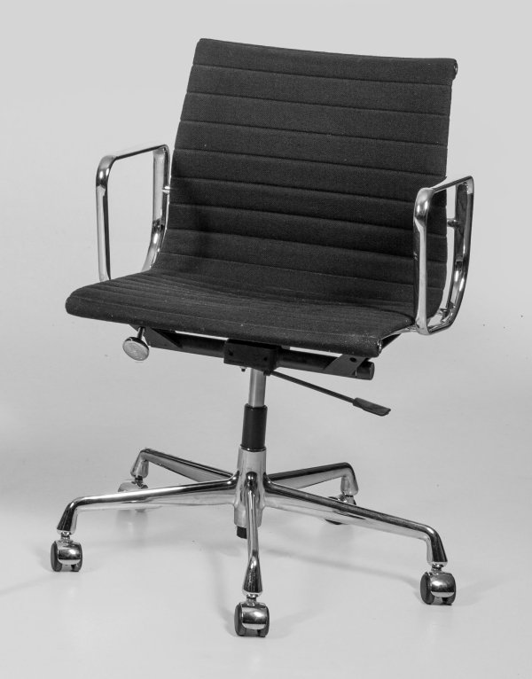 Modell EA 117. Aluminium, verchromt und schwarzer Stoff. Zylinderförmiger Schaft auf sog. Stern-Fuß mit Rollen als Träger für höhenverstellbare, flache Sitzfläche, in entsprechende Rückenlehne übergehend. Seitlich gebogte Armlehnen. Herstellerzeichen. Entw. Charles Eames, 1958. Sitz-H. 42-55 cm.